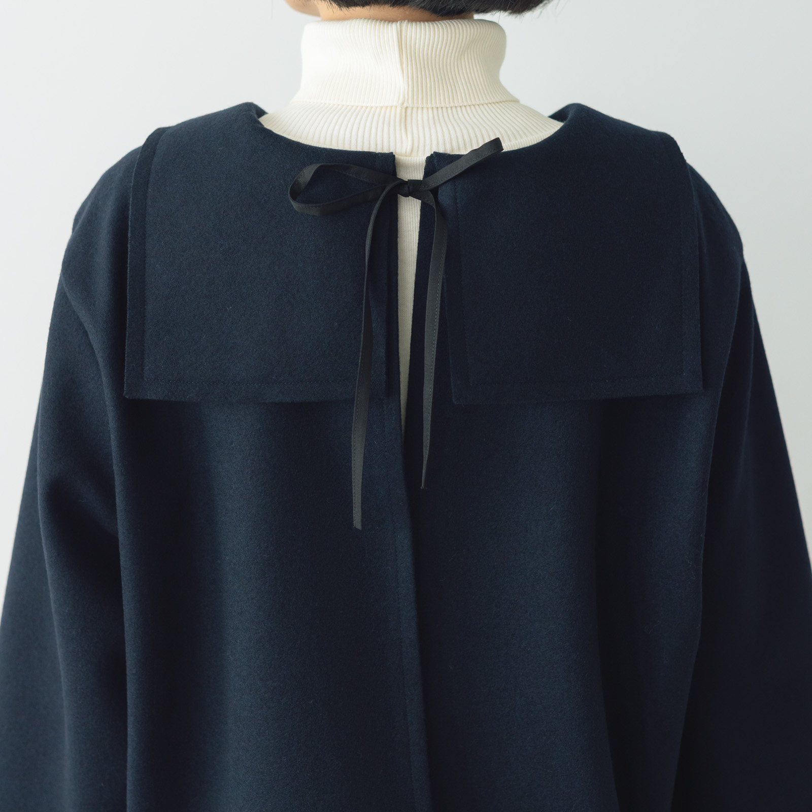 襟元がデザインのポイントで、フロントはフラットカラー、バックはスクエアカラー+リボンで印象が変化。どちらを前にしてもOKな仕様です。襟元はキュートな印象ですが素材は上品なので、カジュアルにもキレイめにも着こなしていただけます。