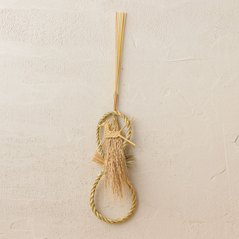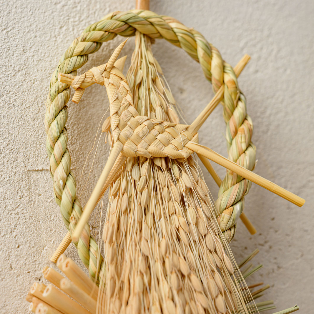 山形県の稲藁と稲穂を使い、職人さんによる昔ながらの手業を用いて作られた「工房ストロー」さんのしめ飾り。パーツを繋ぐ部分は、針金や紐など異素材は使わず、全て稲だけでつくられているため、まさに“自然に還るしめ飾り”です。
