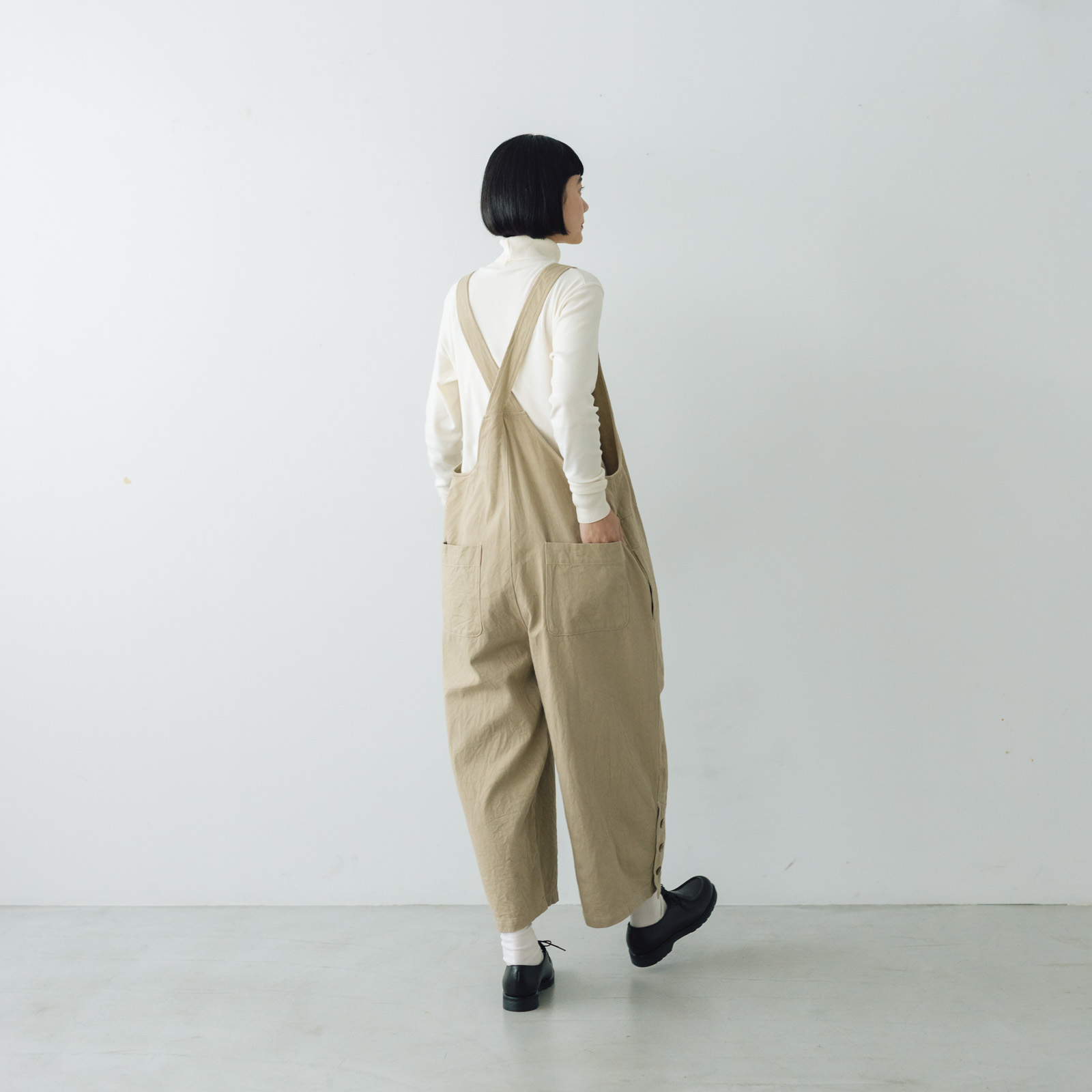 洗いがかかったくったりとしたコットン生地で仕立ててあるサロペット。