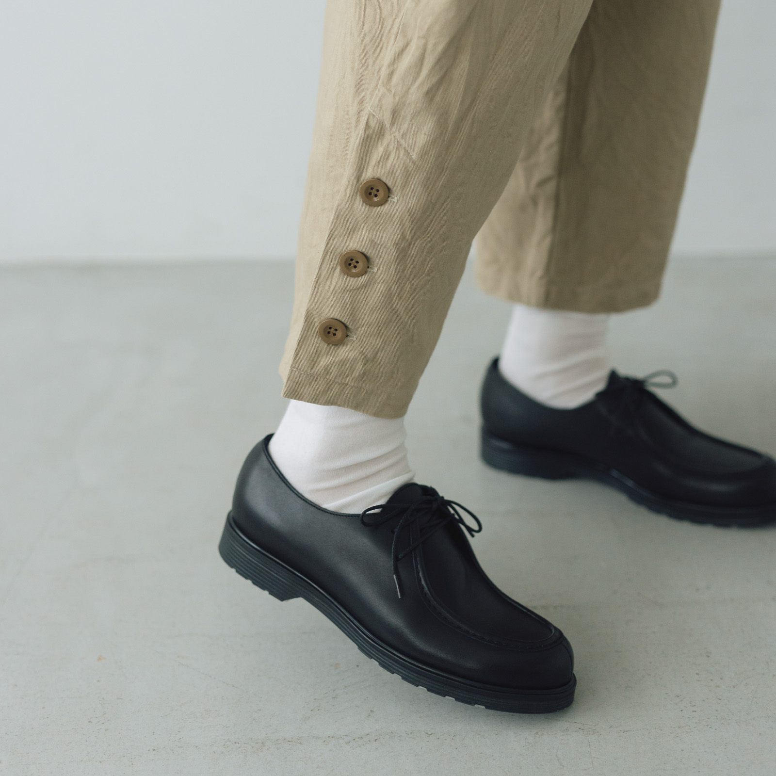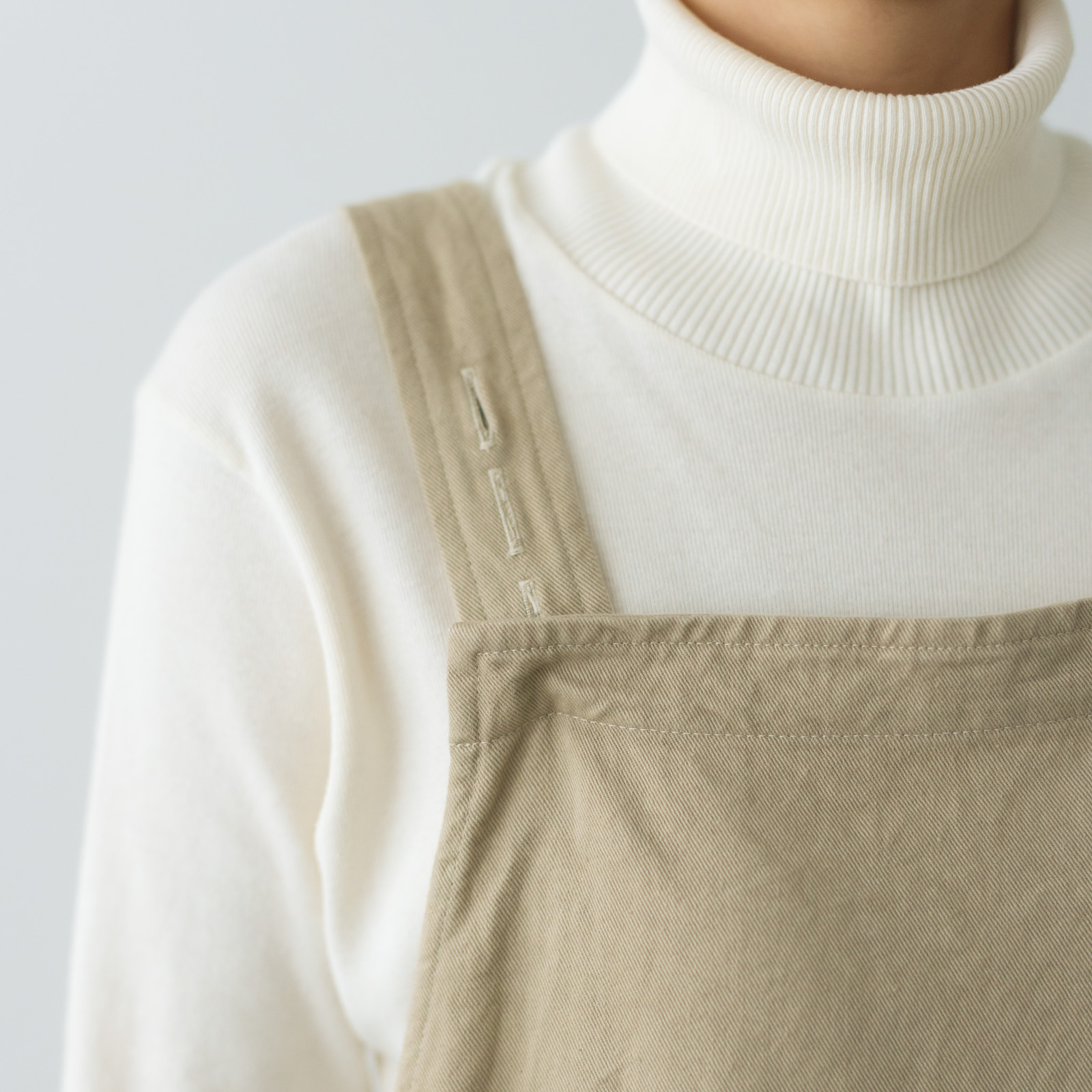 使用しているのはコットンドリル。コットンドリルとは、太い綿糸を使い経糸の密度を高めて織られた厚手で丈夫な生地で、耐久性とソフトな手触りが特徴。作業着や軍服に使われてきた歴史もあり、丈夫さと共にこなれた雰囲気に仕上がっています。