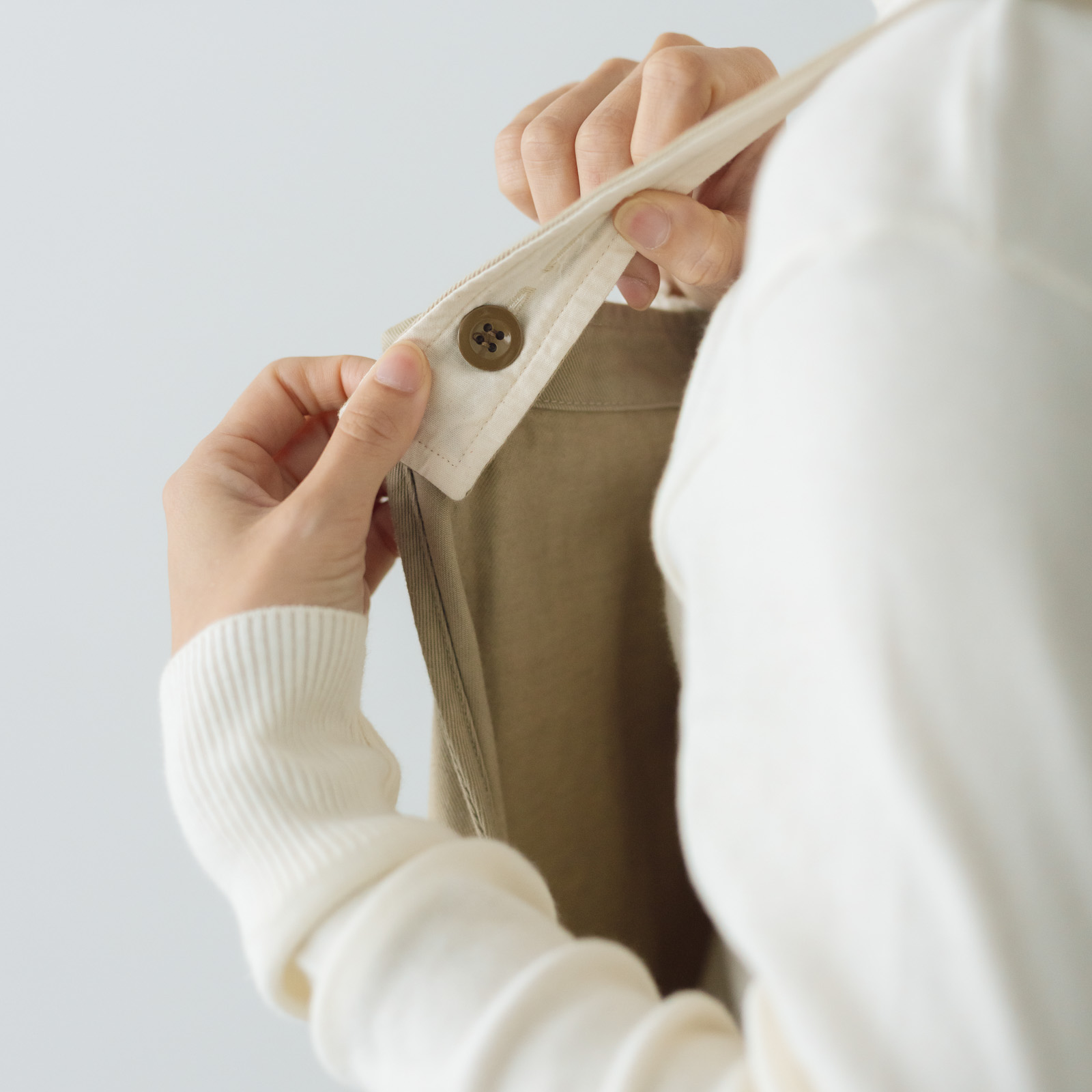 ポイントになるのは裾。ボタンが3つ並んでいることで足元にアクセントをプラス。