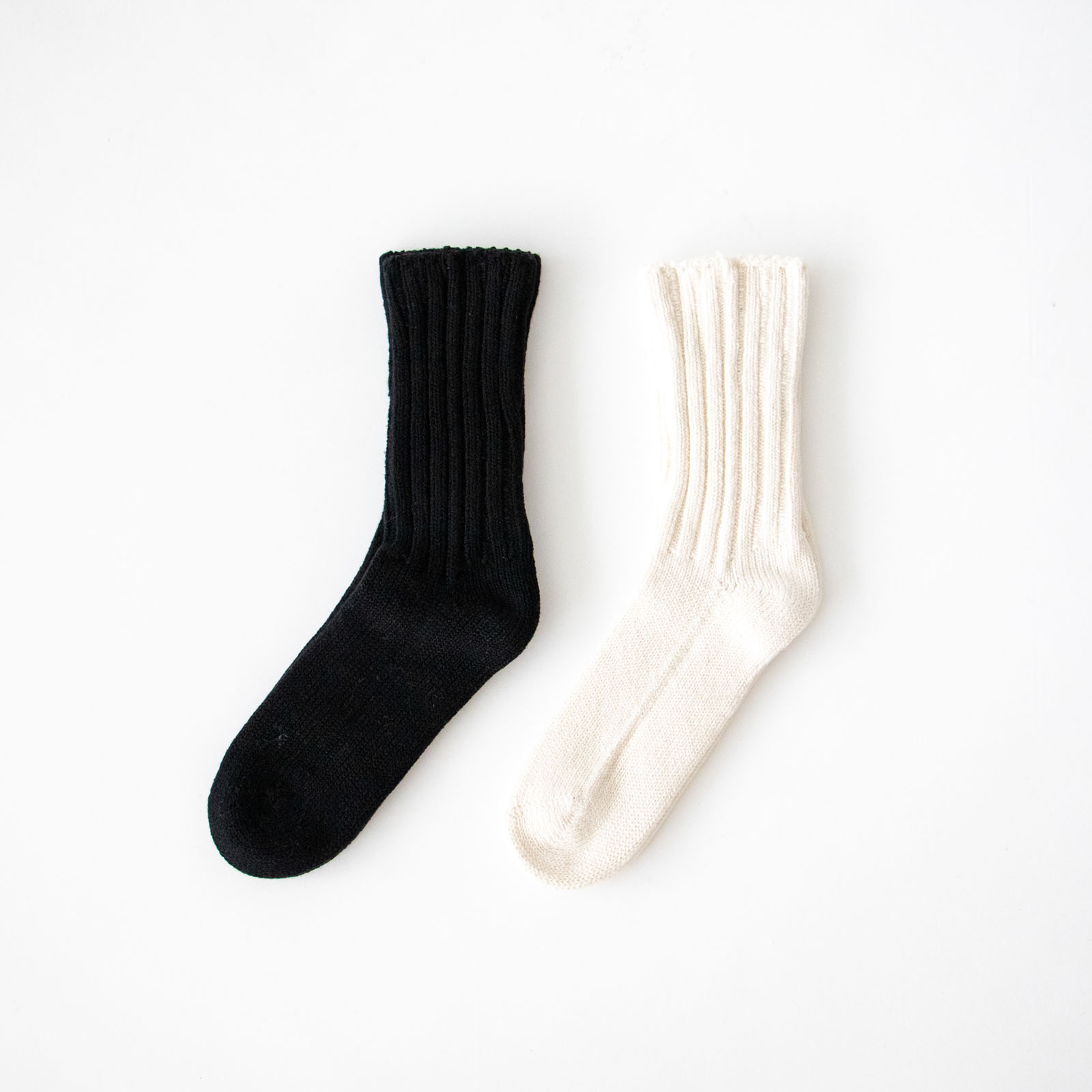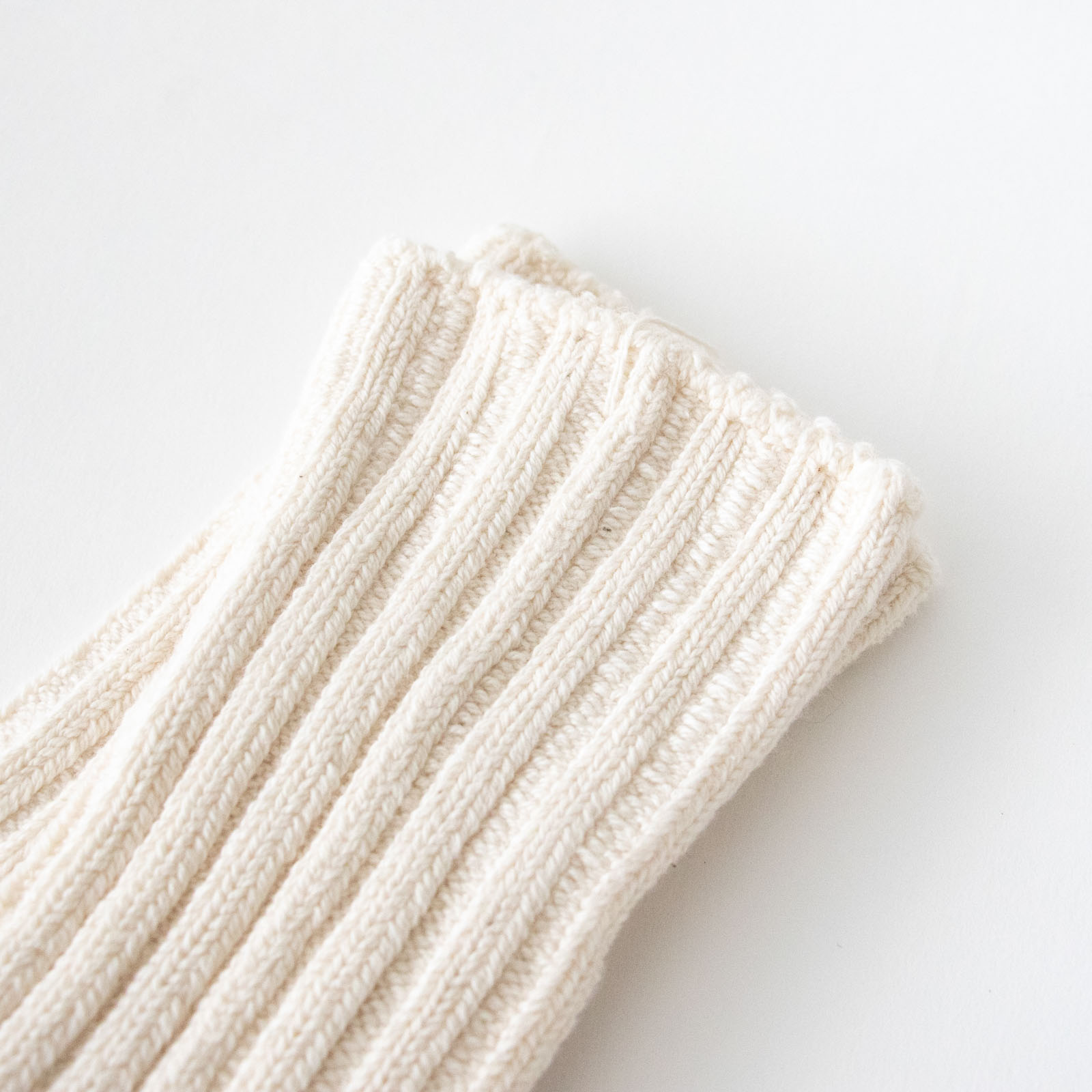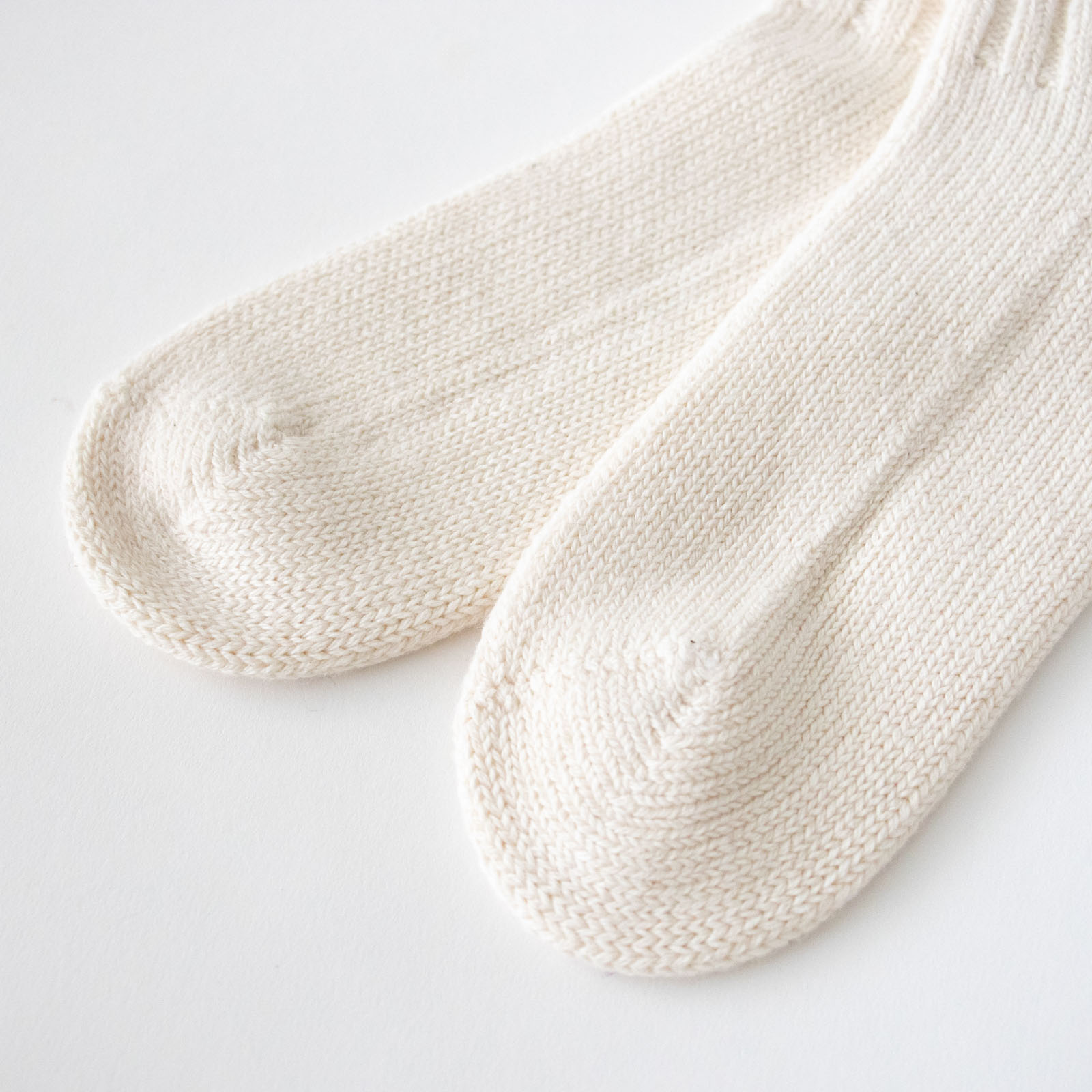 太い糸を両畔編みで丁寧に編み立てており厚手に仕上げてあります。安心感のある履き心地と、ざっくりとした風合いが特長です。