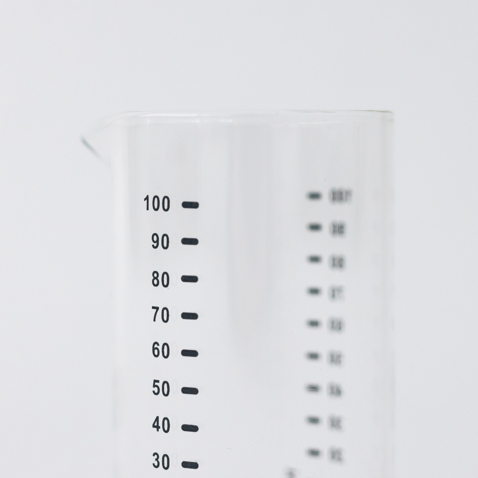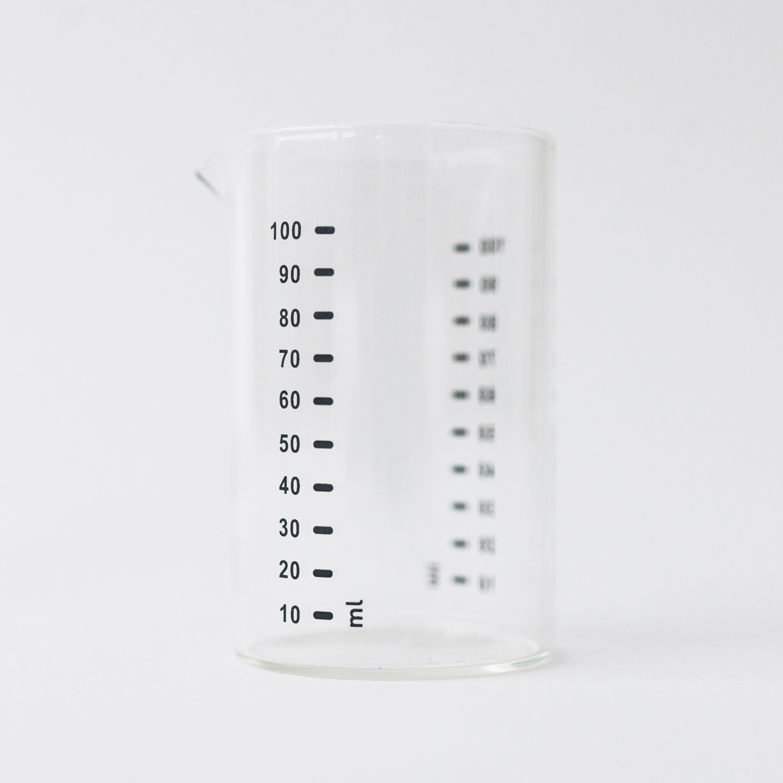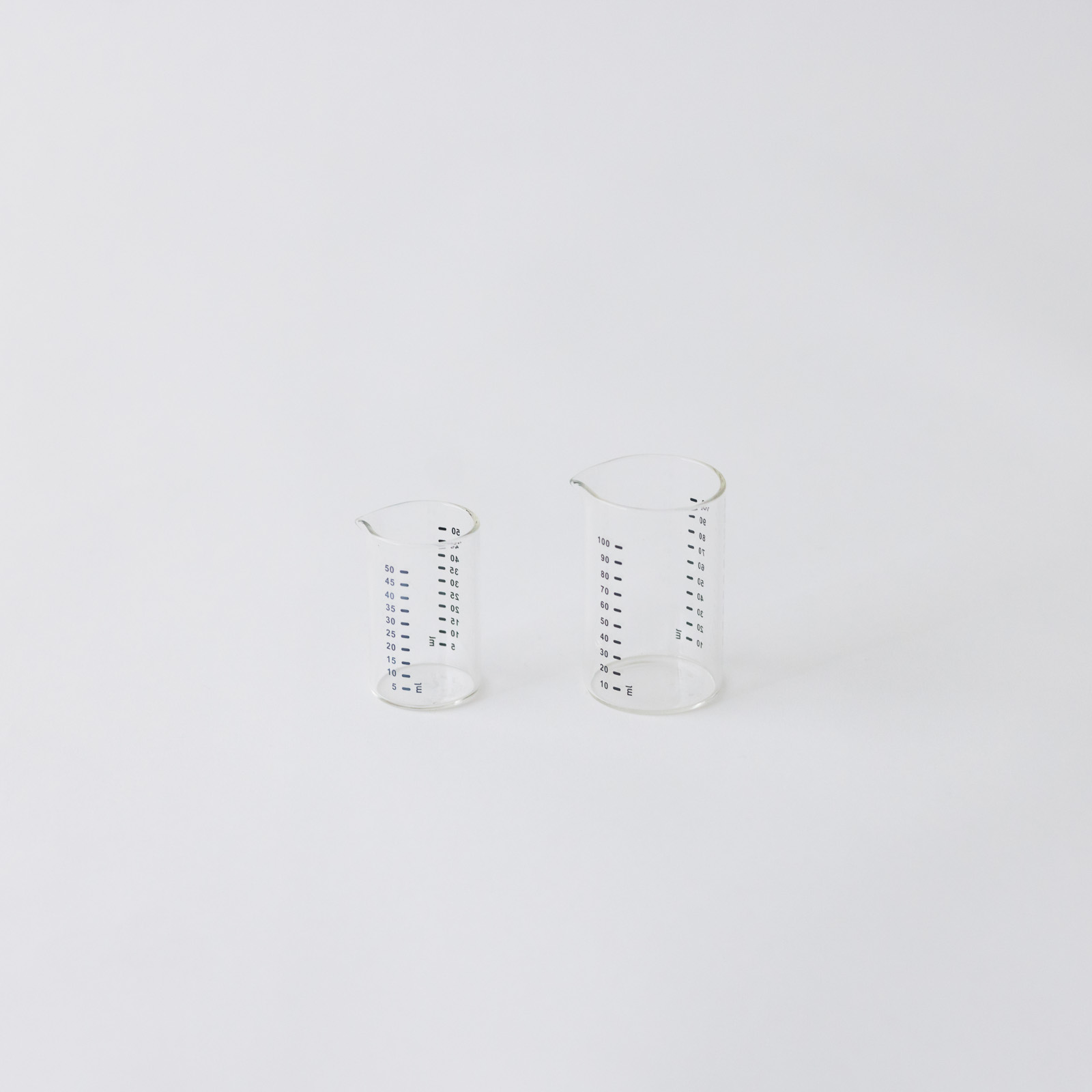 機能美を追求した、すっきりとしたビーカー型。50mlには5ml刻み、100mlには10ml刻みの目盛りがプリントされており、少量の計量をきっちりこなします。サラダのドレッシングや、合わせ調味料を作るときにも便利です。