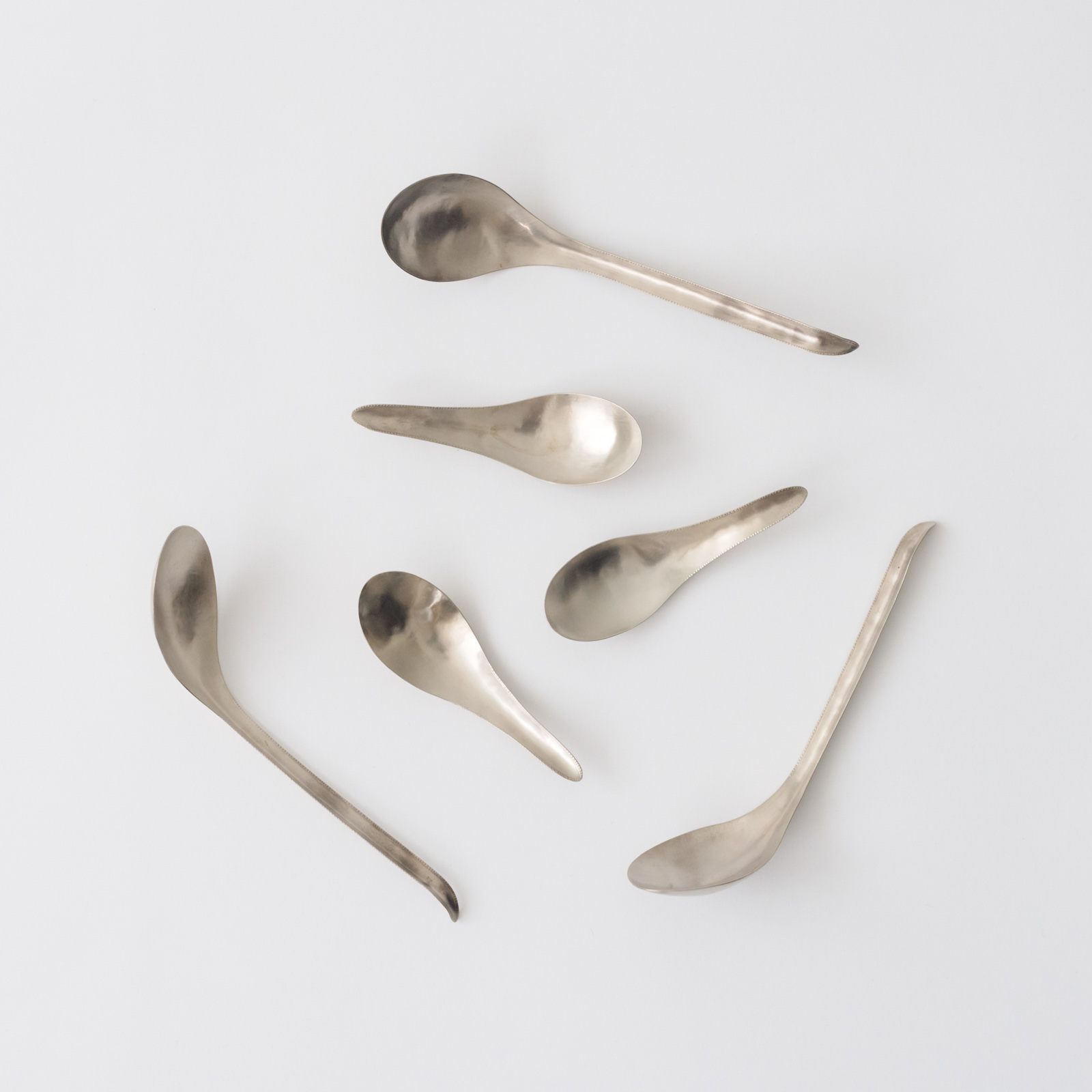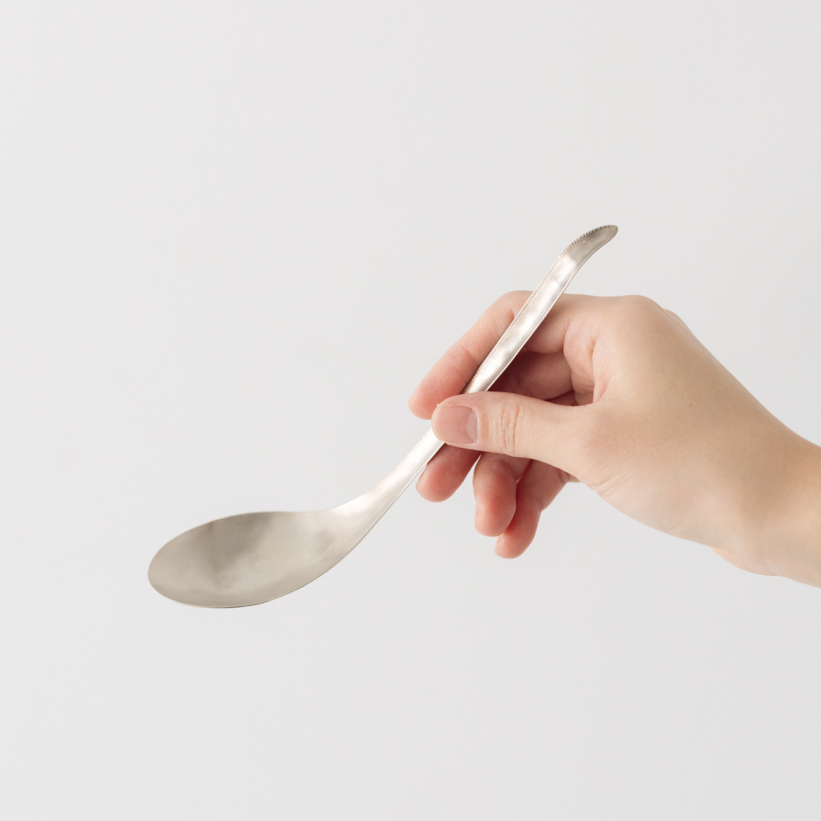 ともに新潟を拠点に活動する、F/styleと金工作家・大桃沙織さん。二組の協働によって生まれた、鍛金の手しごとの跡が息づくレンゲ。大桃さんが、ふだん制作されている作品とは少し趣を変え、装飾を抑えて金属そのものの質感や素朴さが際立つ佇まいに。