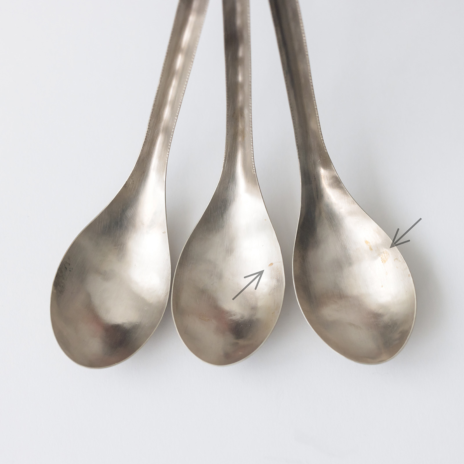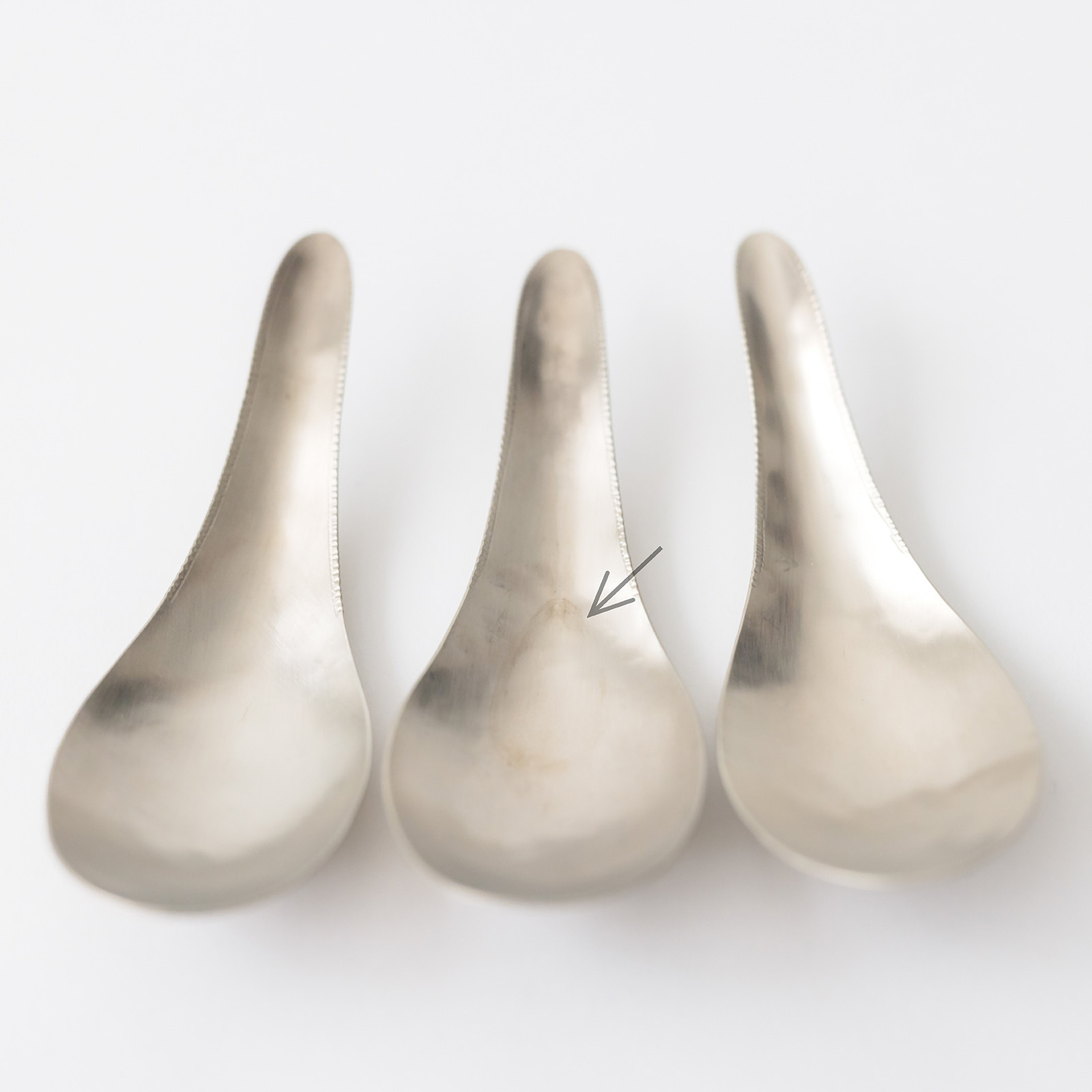 どちらのレンゲも、一枚の金属板を何度も叩いて、立体にしていく「鍛金」の技法によって、一本ずつ手作業でかたちづくられています。素材は、アンティークの食器やカトラリーをはじめ、フルートなどにも使われる洋白(ようはく)。どこか温かみを感じさせる柔らかな色や、口当たりが優しく、手に馴染む感覚もこの素材ならでは。使い込むほどに光沢が落ち着き、深みが増していきます。