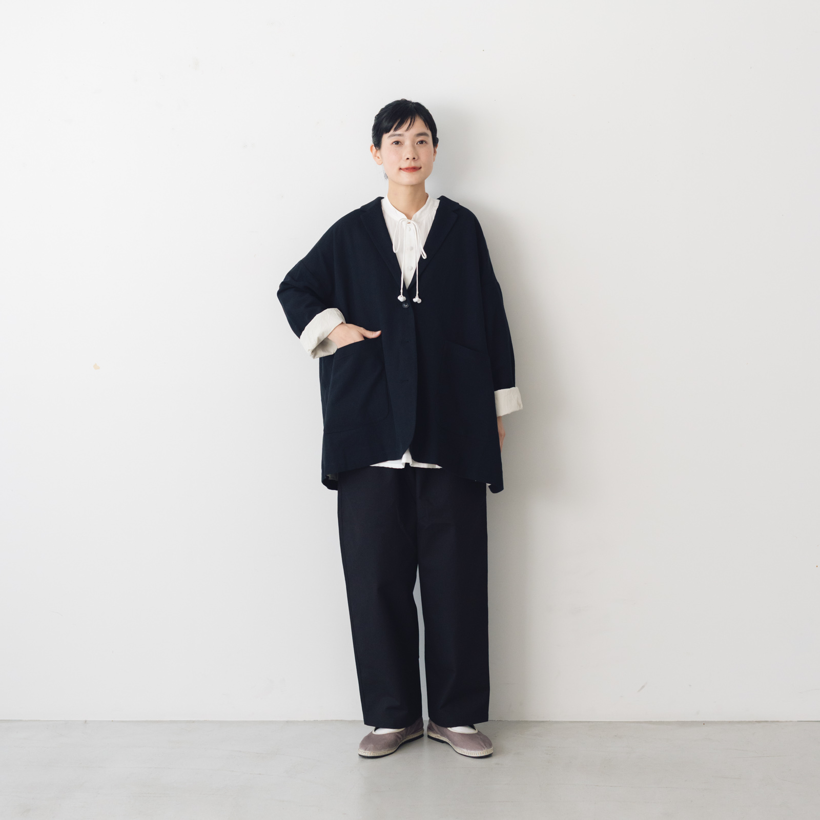 胸元には思わず見惚れてしまうほどの、細く繊細なピンタックがずらり。背中も同じように施してあり、職人の手仕事を堪能できます。そのピンタックのお陰で胸元から自然なAラインシルエットができ、バランスよく着こなせます。
