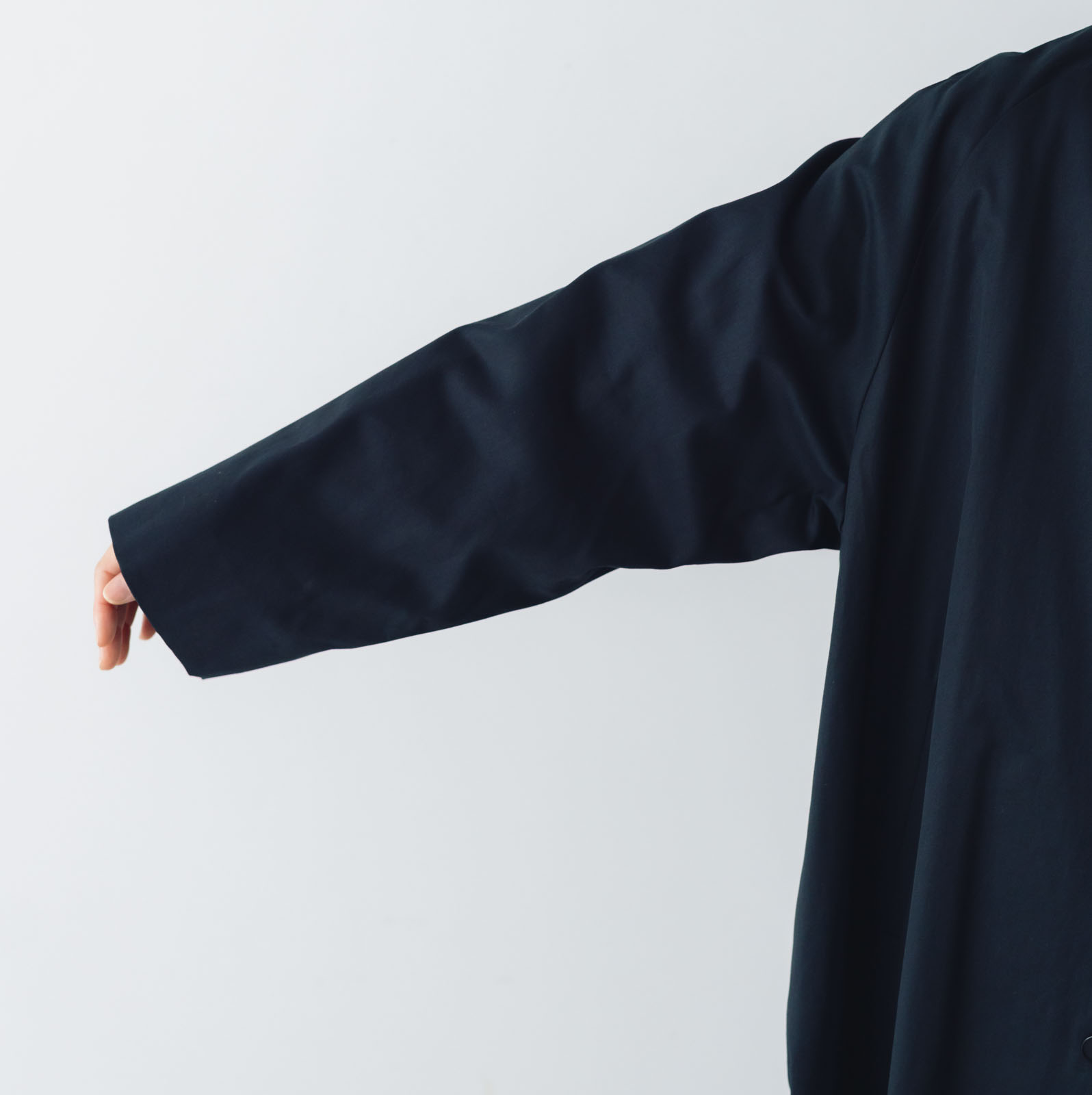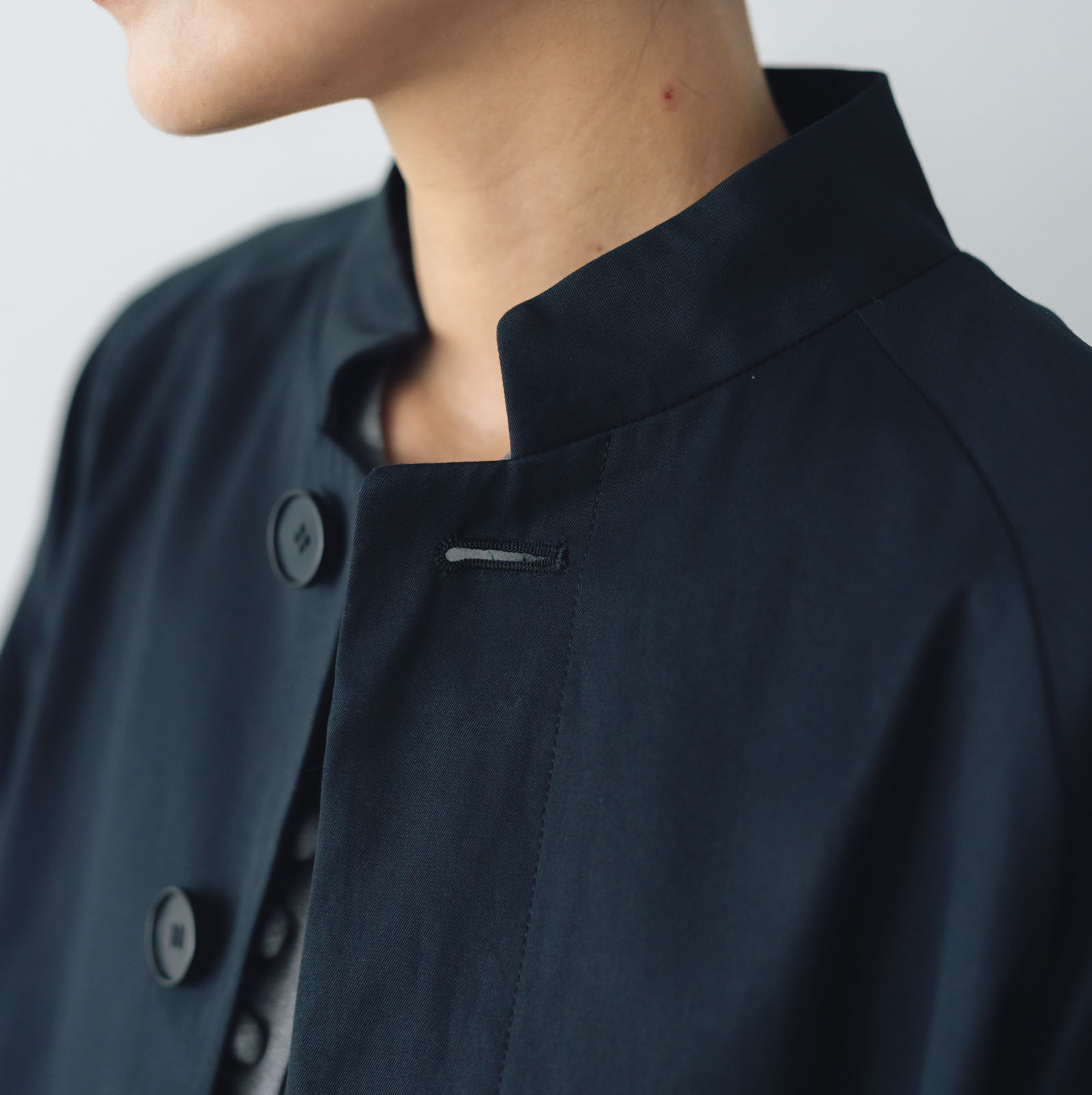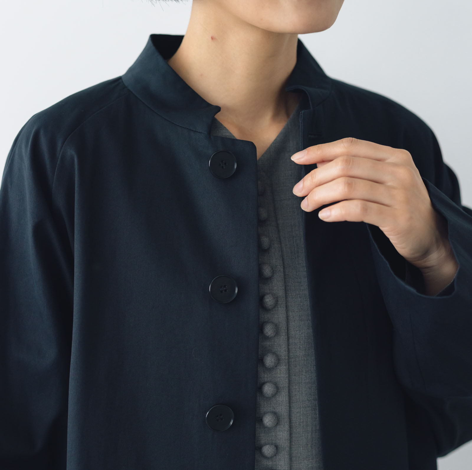 スタンドカラーに比翼仕立ての前立て、肩に沿うラグランスリーブ、動きやすい長めの後ろベント。