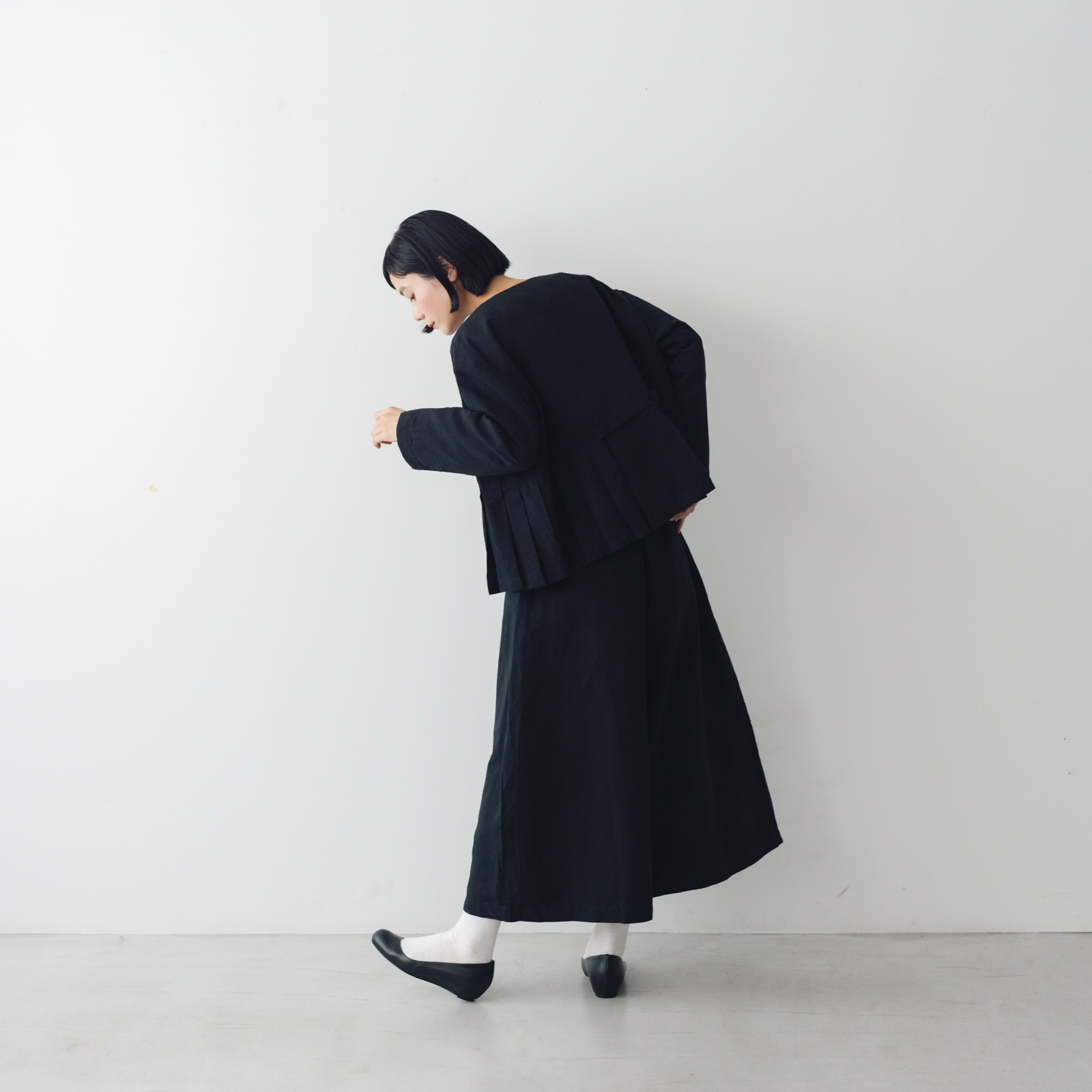 フロントの前立てにはダブルに並んだくるみボタン、裾にはぐるりとプリーツが入り、MAGALIらしい個性が光ります。動くたびにプリーツが揺れ、華やかな印象に。