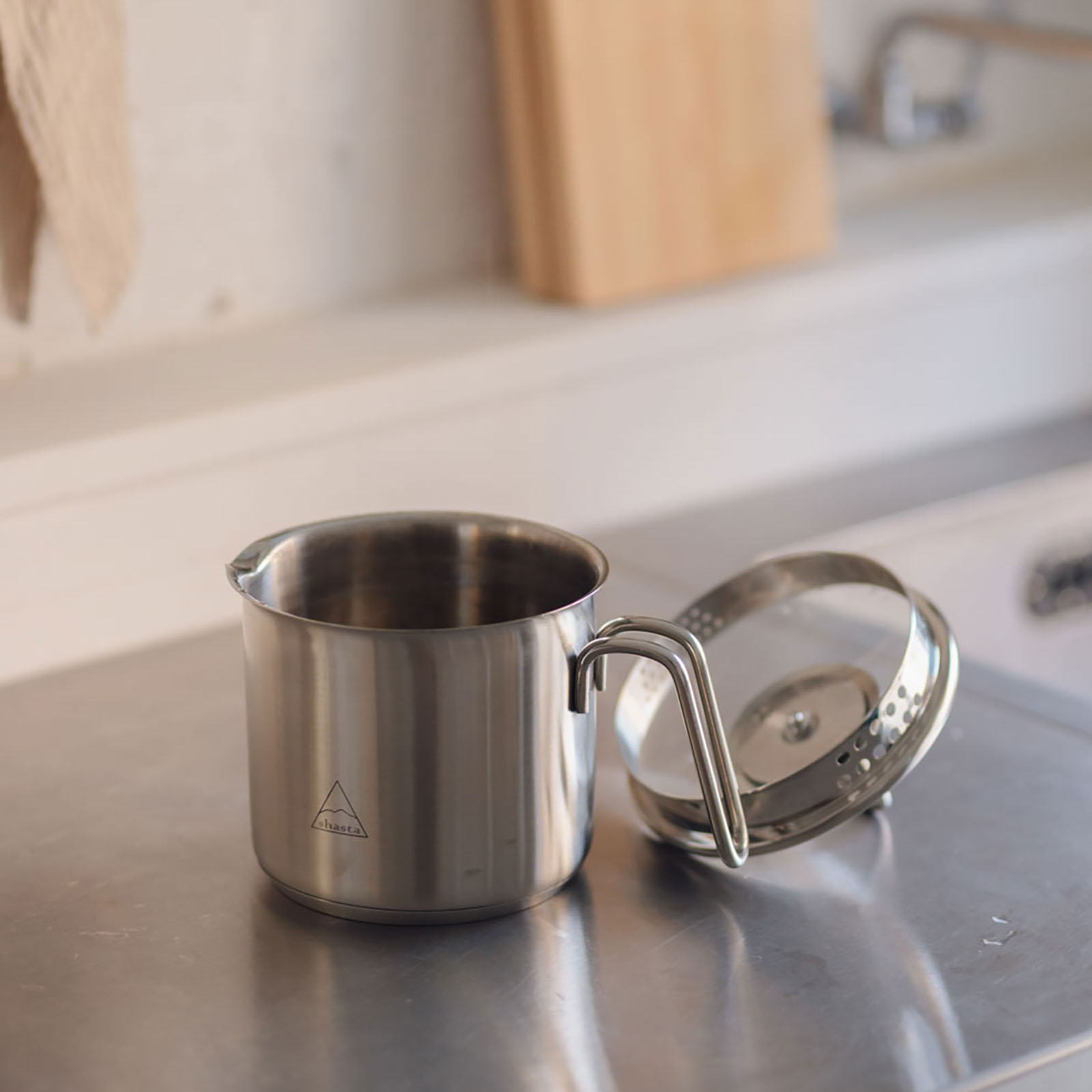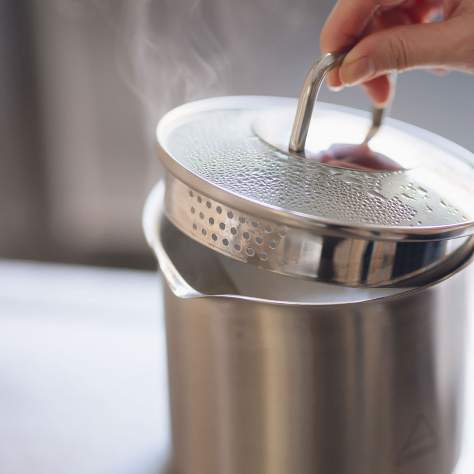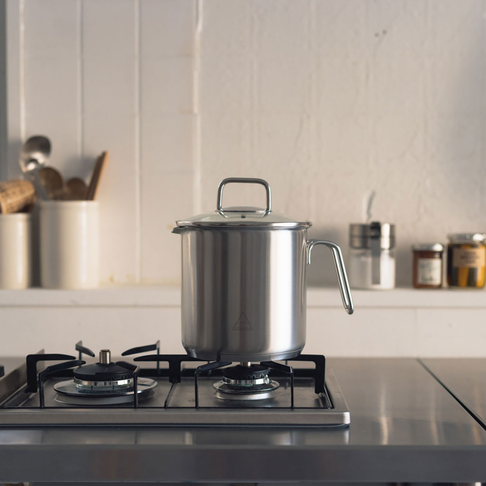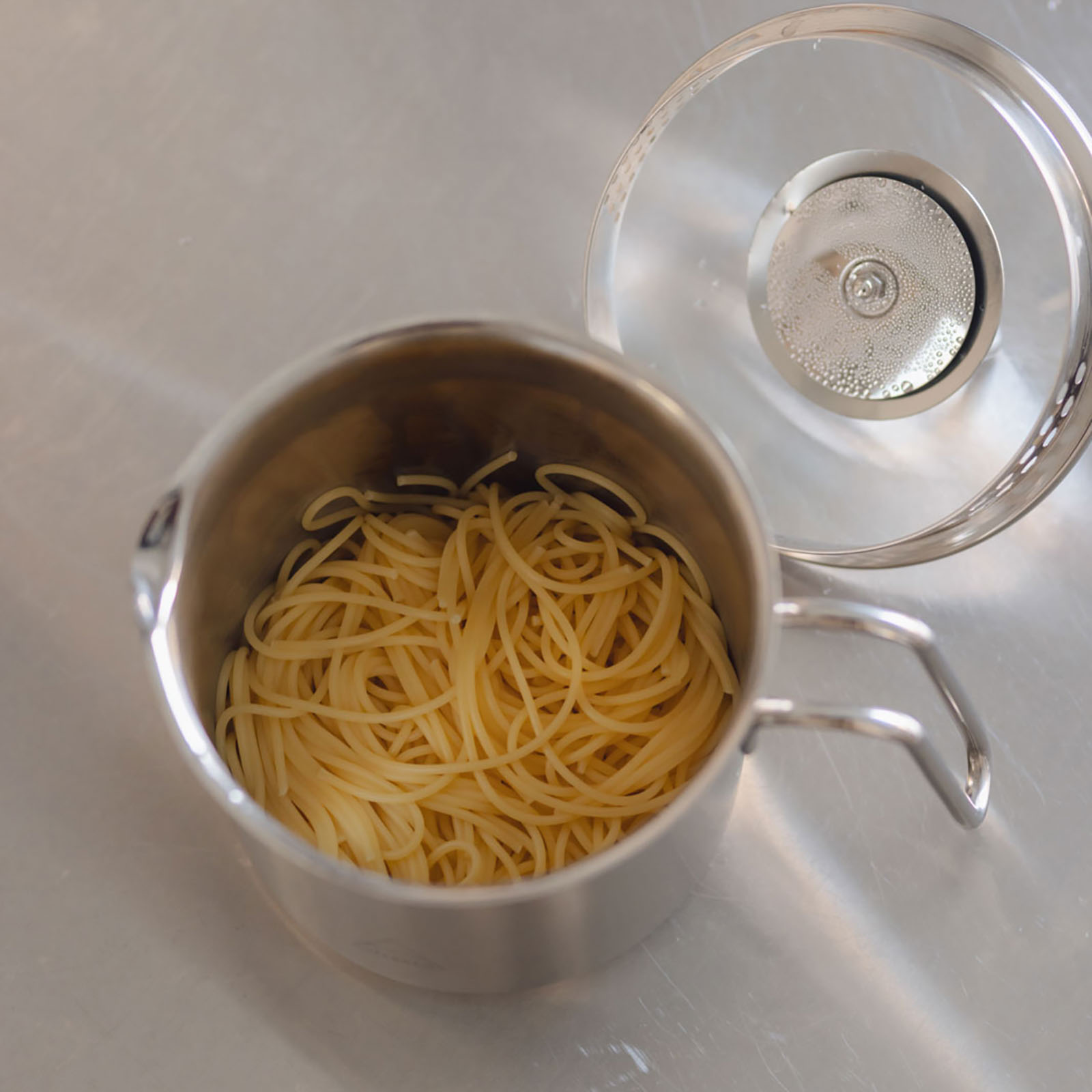 いわゆる「マルチポット」と呼ばれる多機能鍋は、丸みのある形やカラフルなデザインのものが多いですが、こちらはステンレス製のすっきりとした佇まい。縦長のフォルムでパスタを茹でられるくらいの容量がありながら、コンロの上では場所を取らずすっきり使えるのがうれしいポイント。