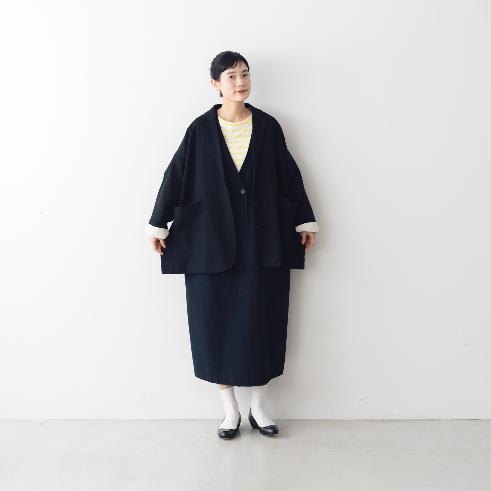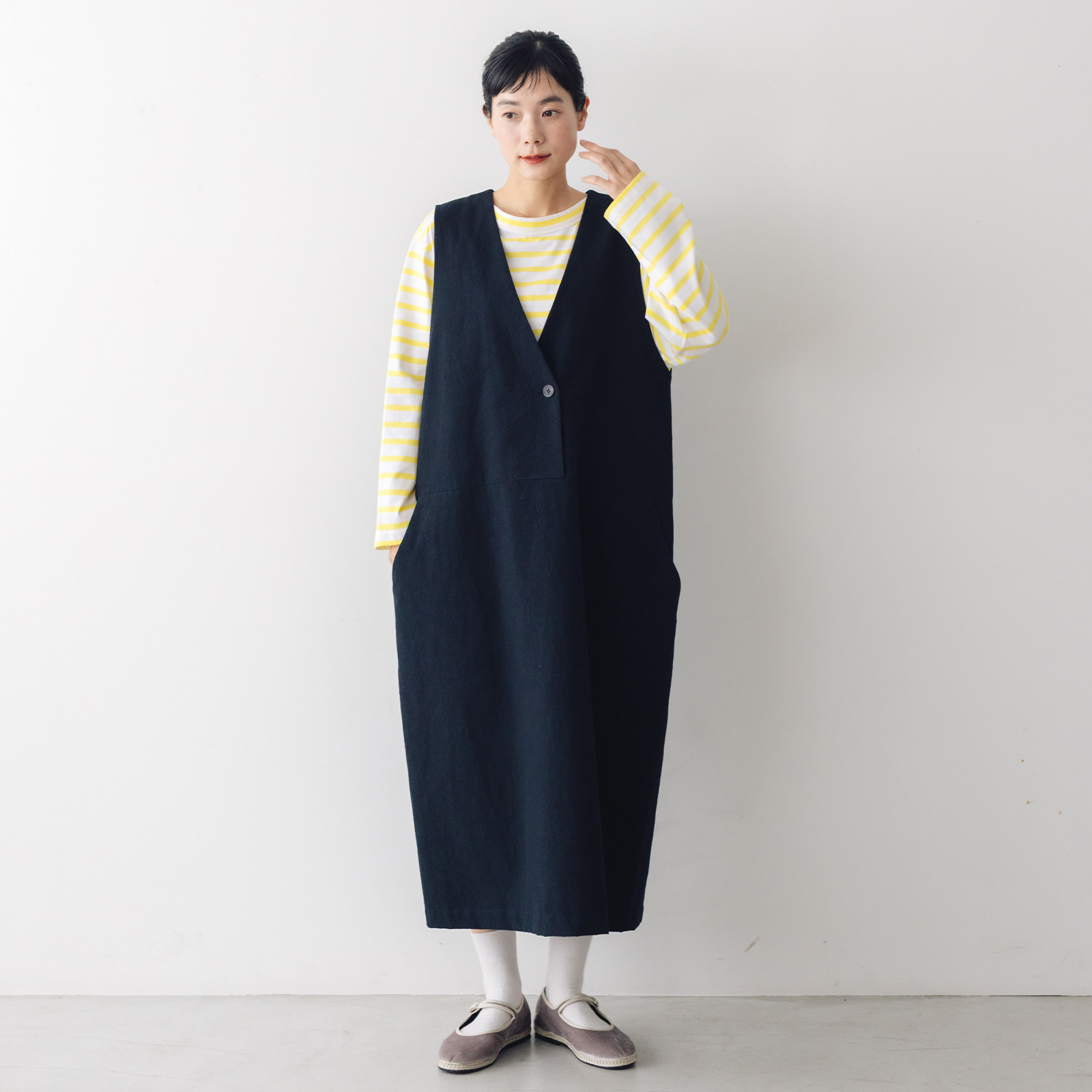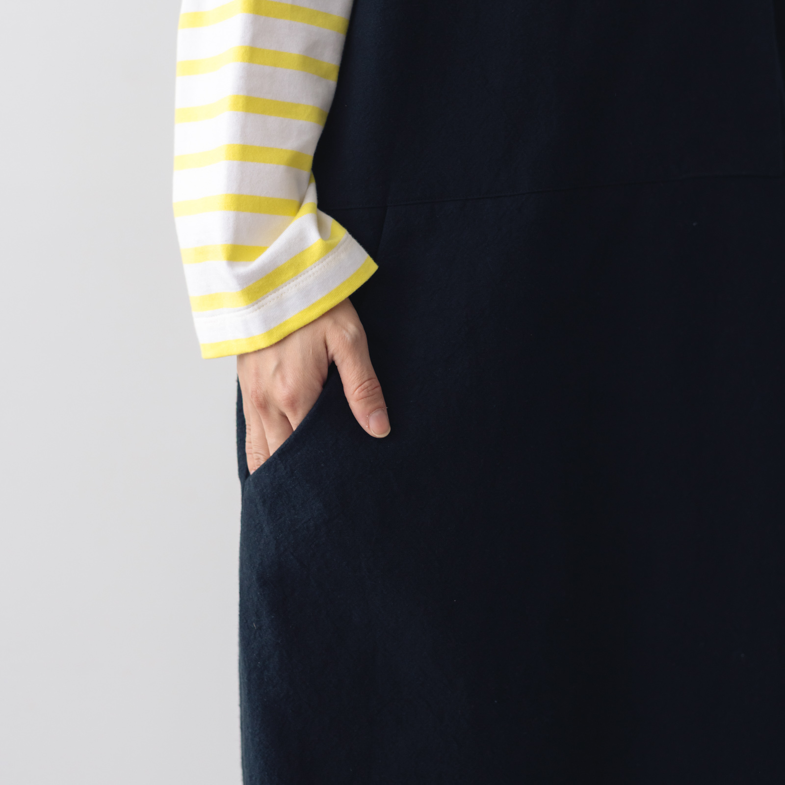 atelier naruse定番のジャンパースカートが綿麻素材になり、ロングシーズン対応仕様に。ストンと落ちるややタイトなコクーンシルエットのスカートがトラッドな上品さを演出します。