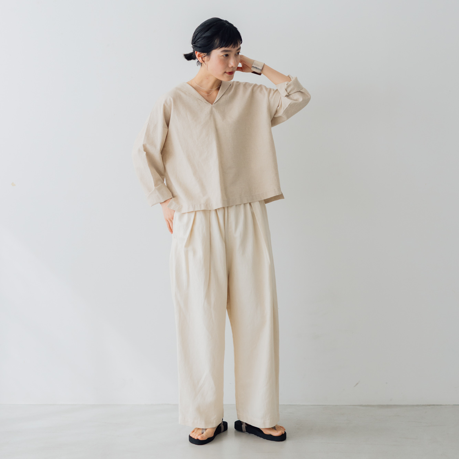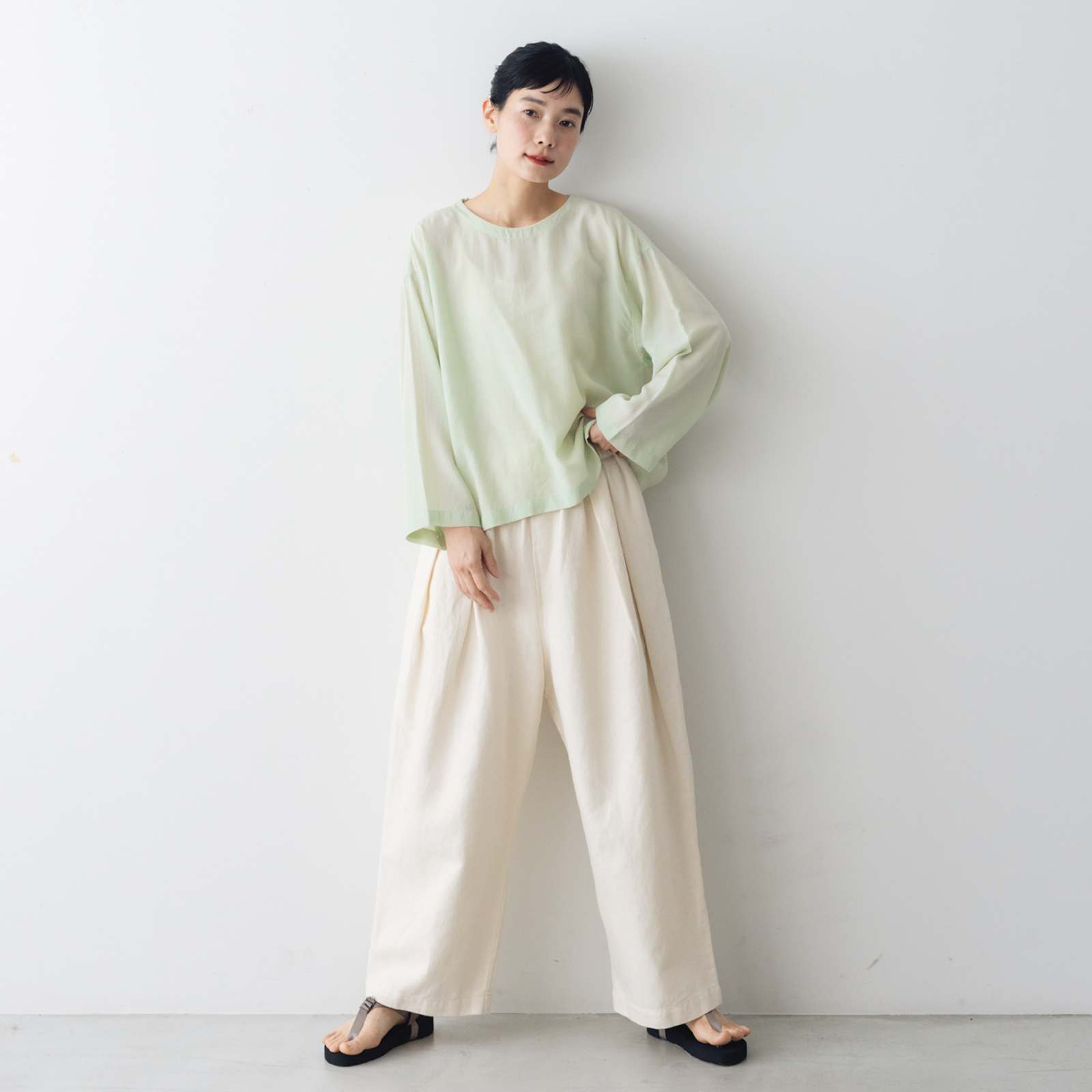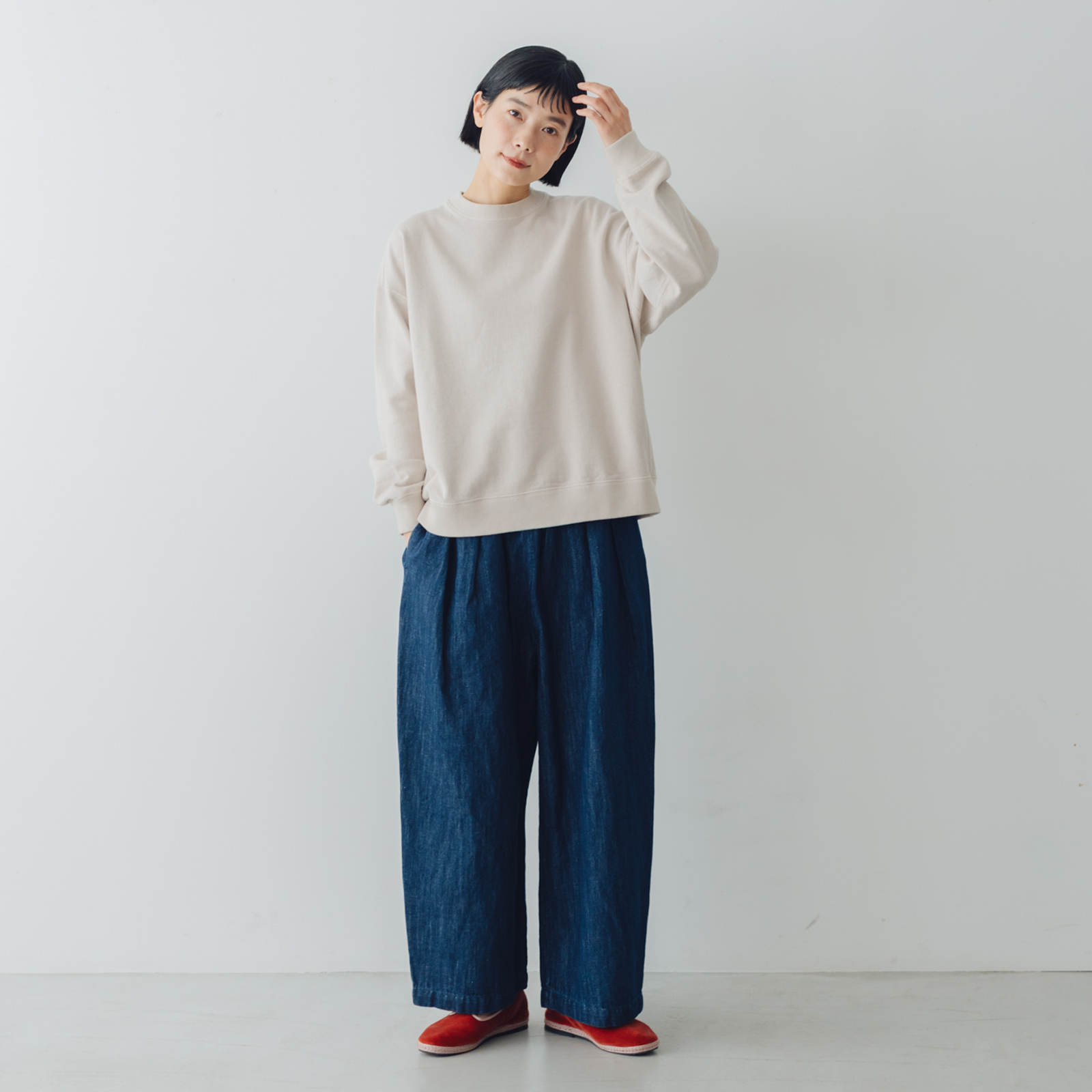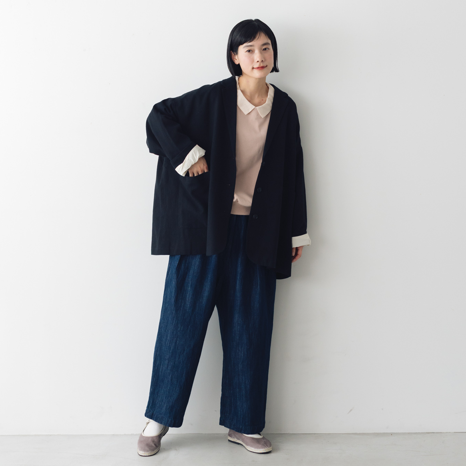 定番カラーのインディゴと、綿カス(植物の破片)を残した表情のあるキナリの2色展開。同じコットンリネン素材だけど、色が違うだけで違う雰囲気を持つデニムに。両色ともきれいめスタイルからカジュアルスタイルまでどちらも対応できる色味です。