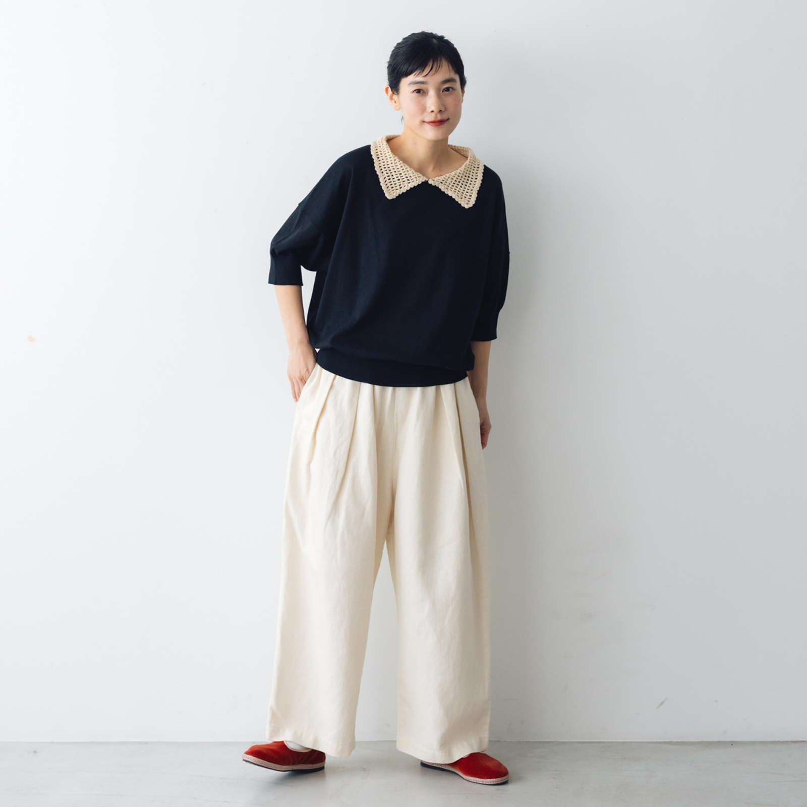 ワイドで、裾にかけて軽く絞ったシルエット。脚のラインは拾わないゆったりとした着心地だけど、下半身をすっきりと見せてくれる絶妙なデザインです。