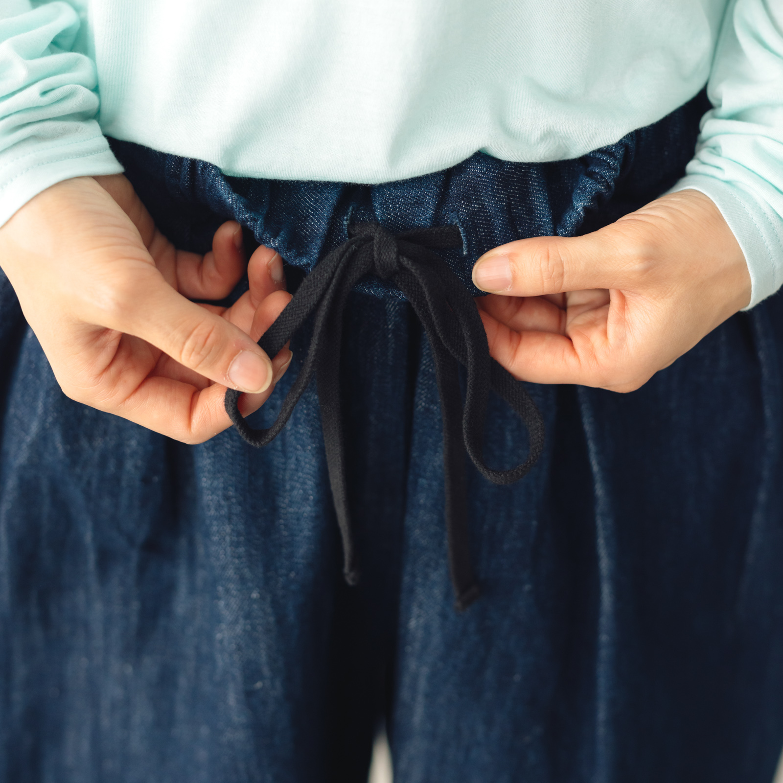 ウエストはゴムと調整紐のイージー仕様で、窮屈さや動きにくさを感じさせないのもポイント。タックが入っているので腰回りをすっきりと見せてくれます。