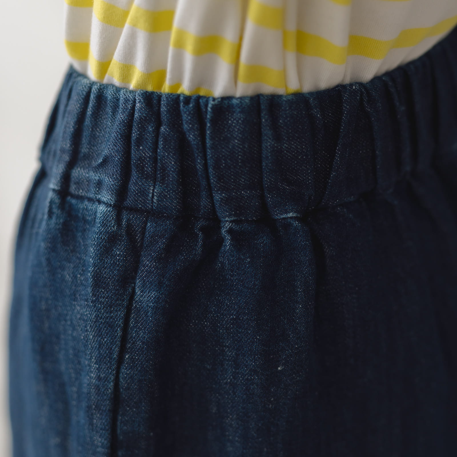 10ozのコットンリネンのデニム生地を採用。程よい厚みがあるので、デニム特有のタフさもありますが製品洗いを施しているので、硬さはなく肌馴染みの良いやわらい肌触りが特徴です。