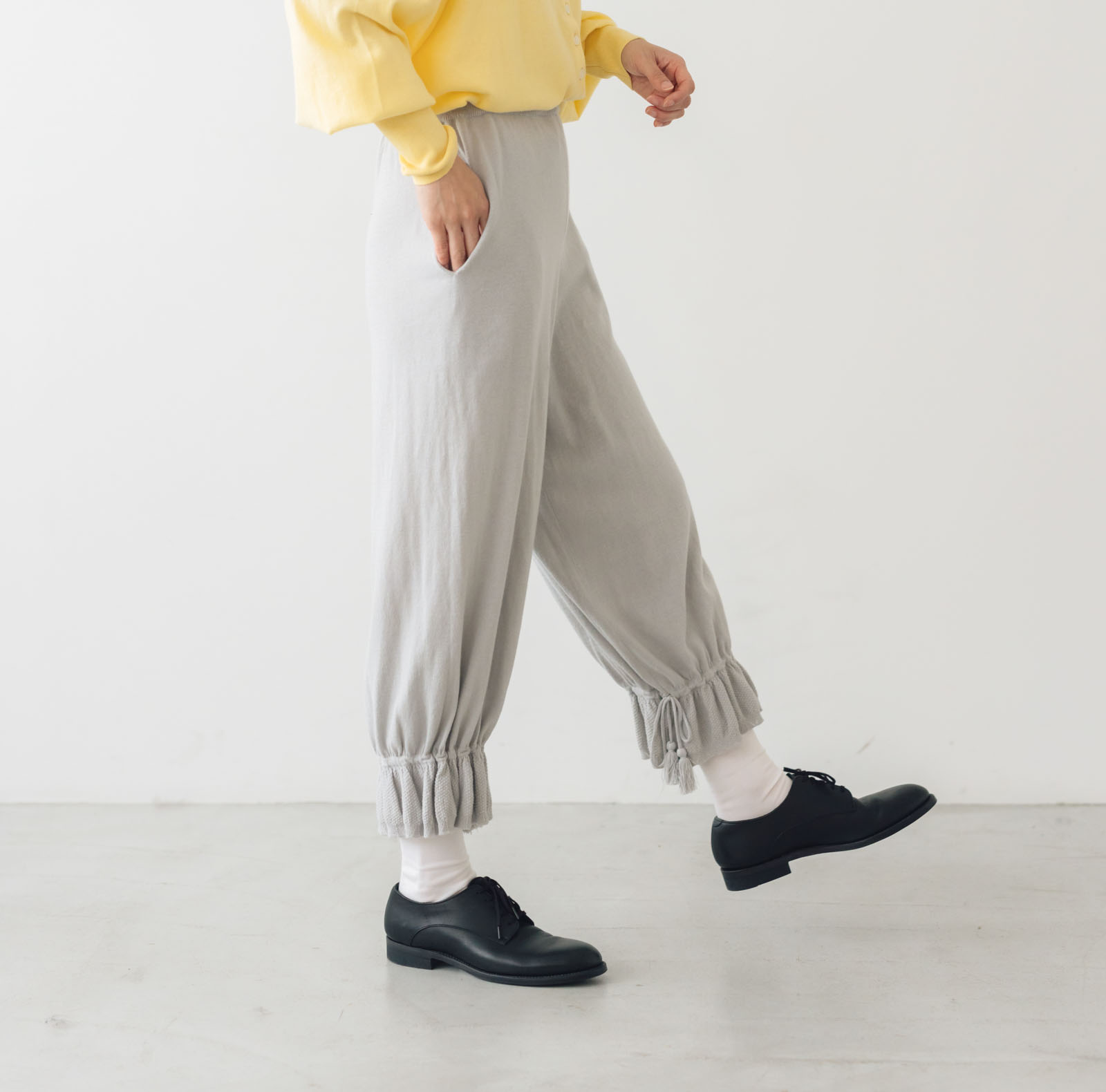 ピエロパンツという名前の通り、ヒップ周りはゆったりしながら裾に向かって細くなるシルエット。さらに裾近くの紐を絞ることでギャザーフリルが生まれ個性豊かな足元を演出します。