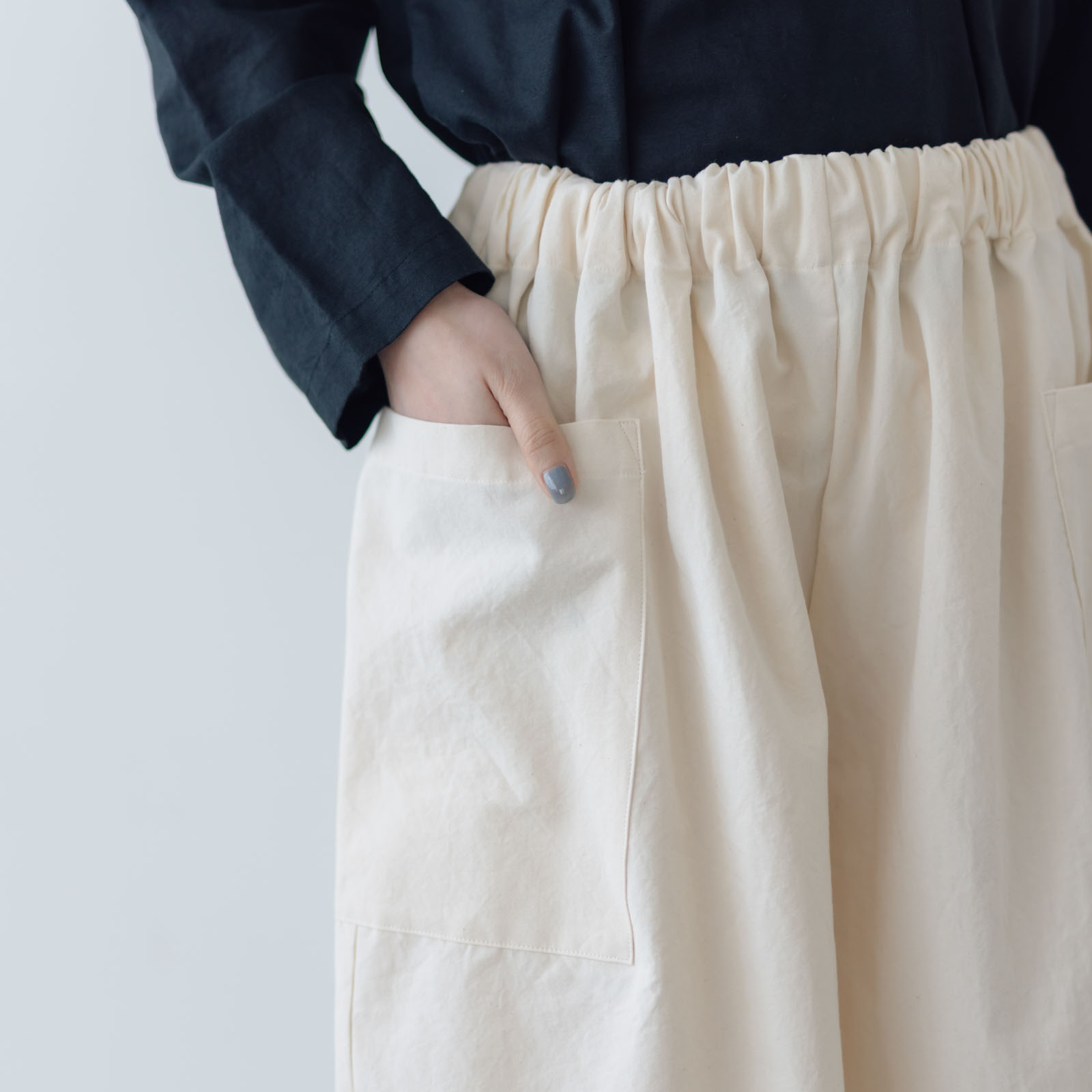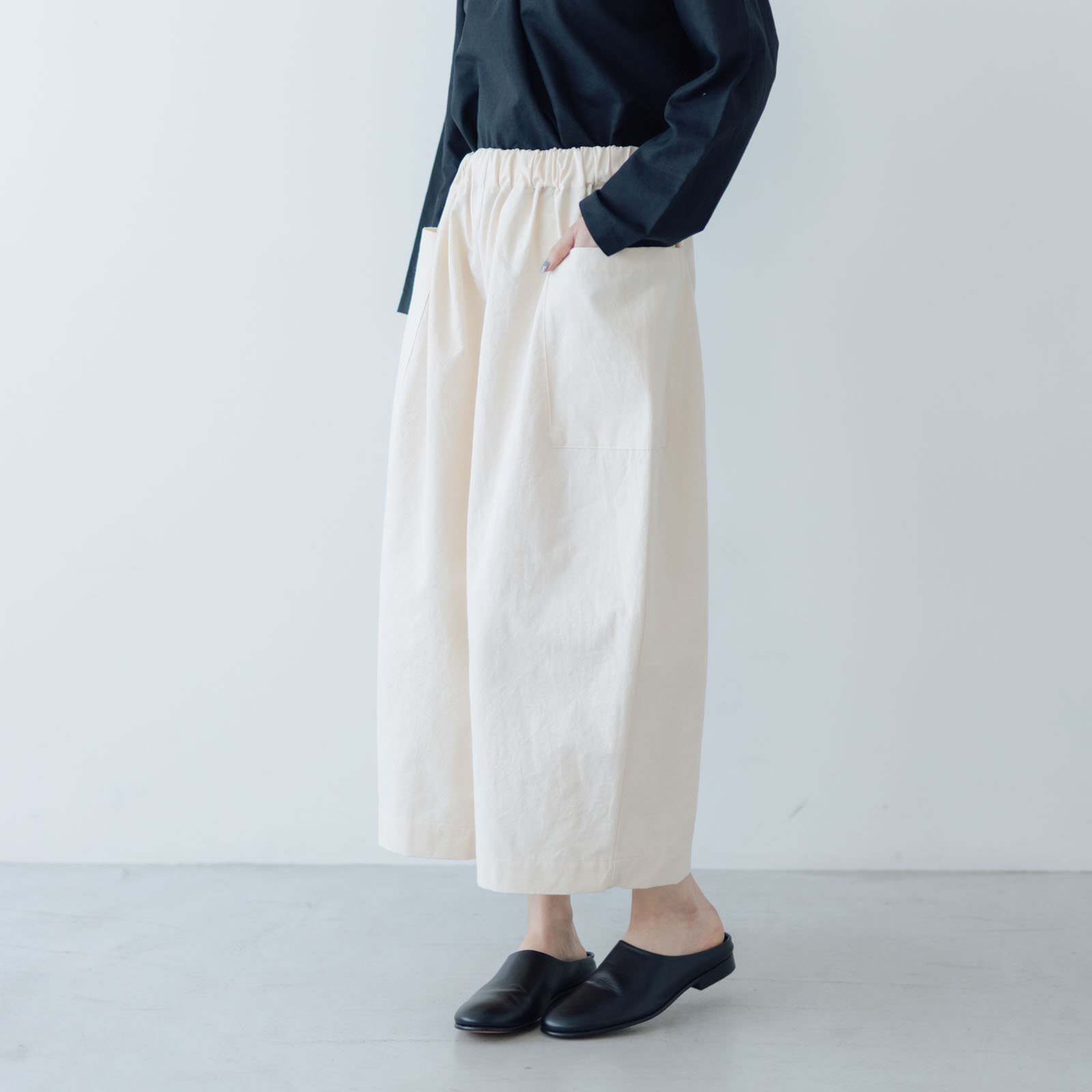 たっぷりと生地を使ったワイドなシルエットが特徴のコットンパンツ。