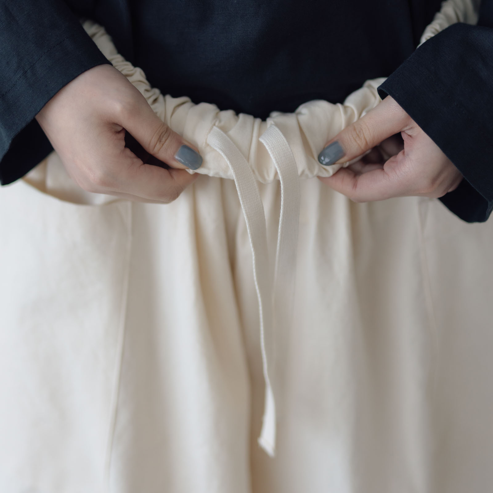 ゴムウエストをアジャスターで調整する仕様で、腰回りもゆったりとしているので楽ちんな履き心地です。