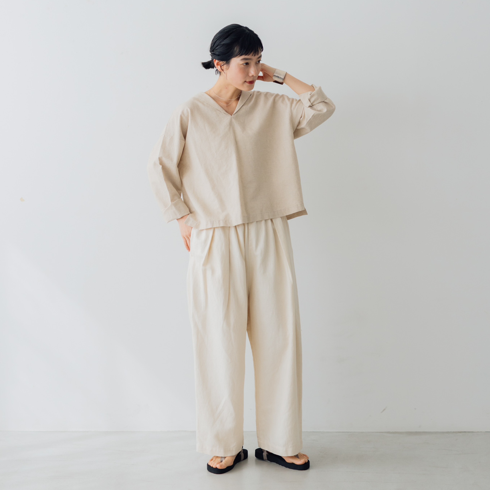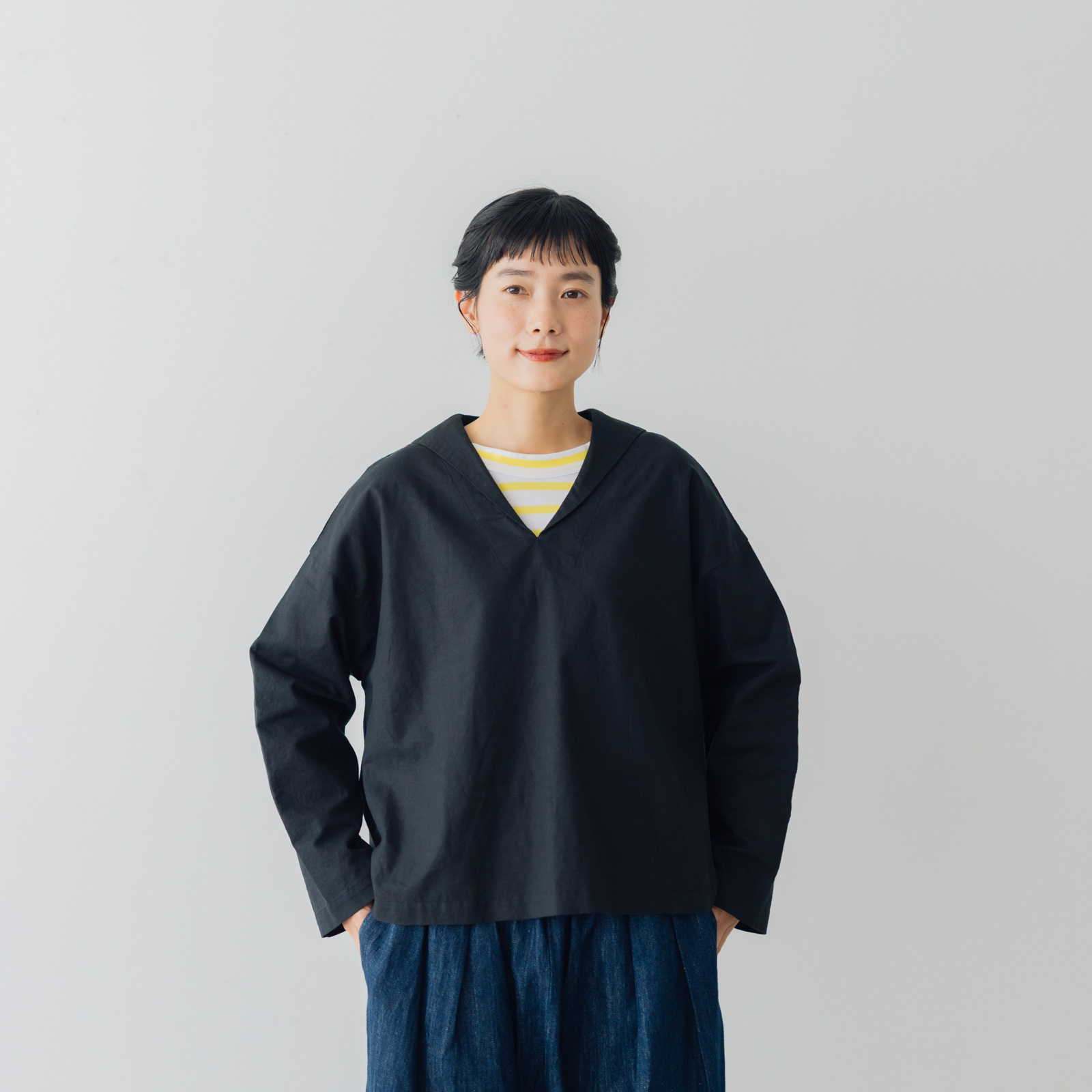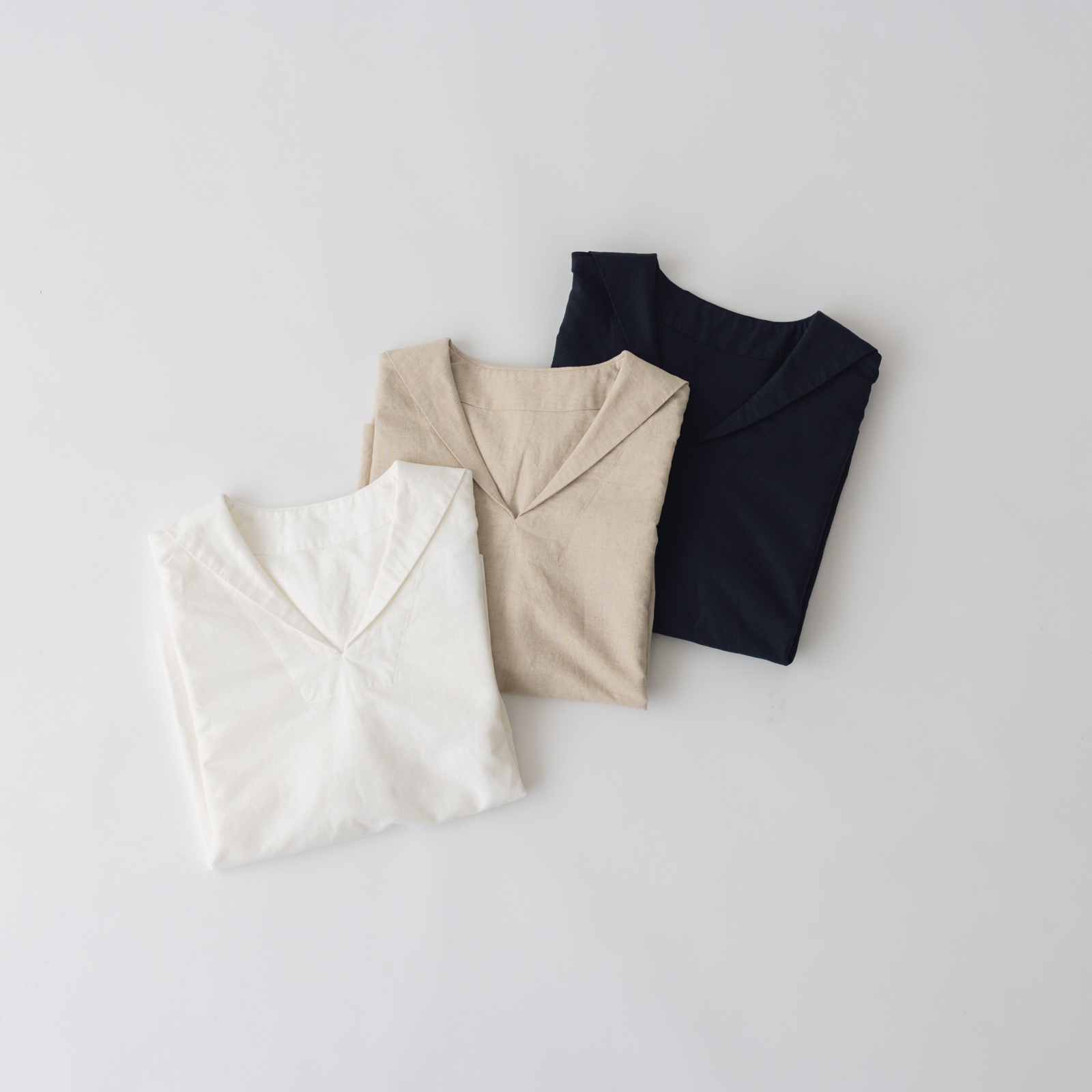襟にラインなどの装飾も施さず、余計なものは削ぎ落とすことで、大人のわたしたちにも似合うセーラーカラーブラウスに仕上がりました。