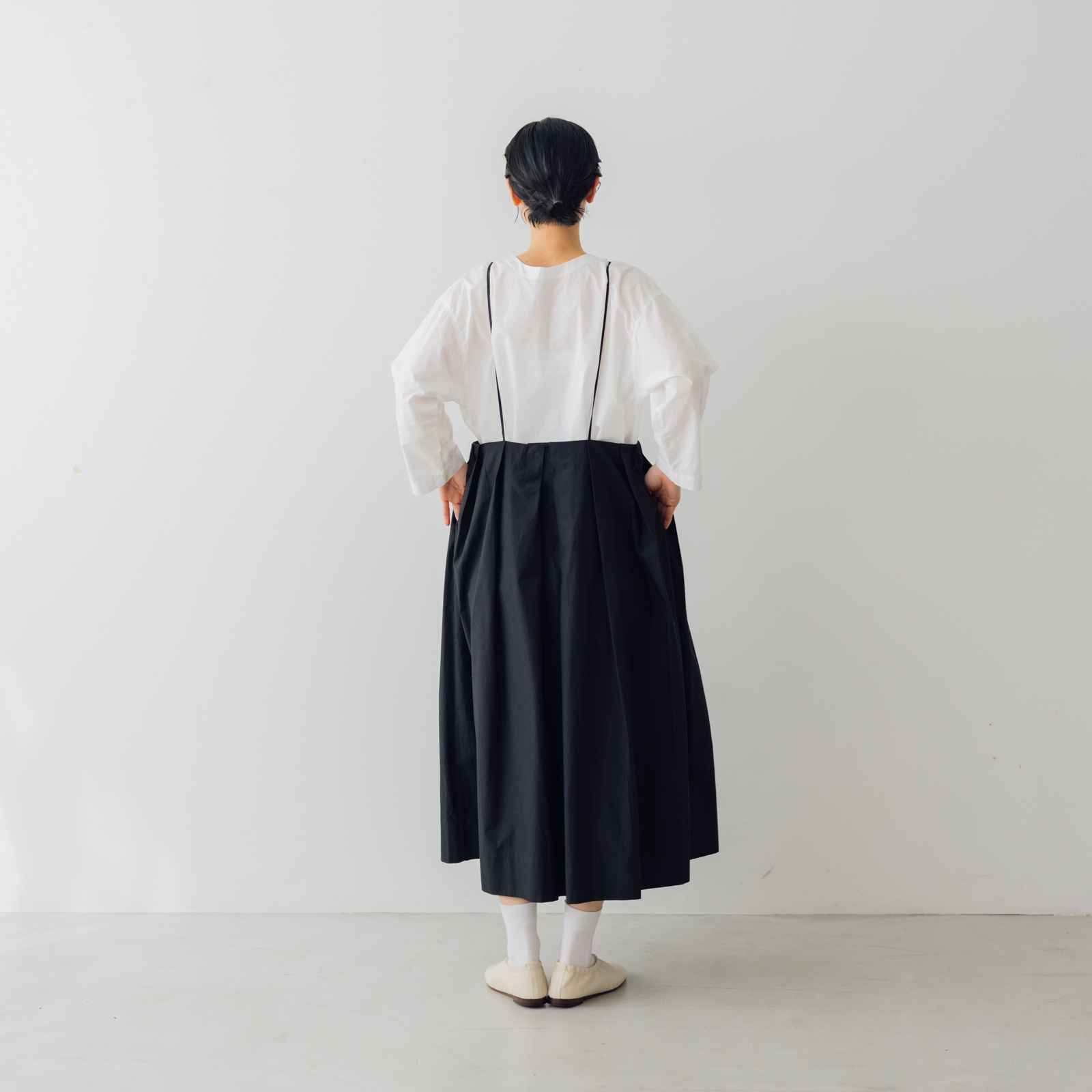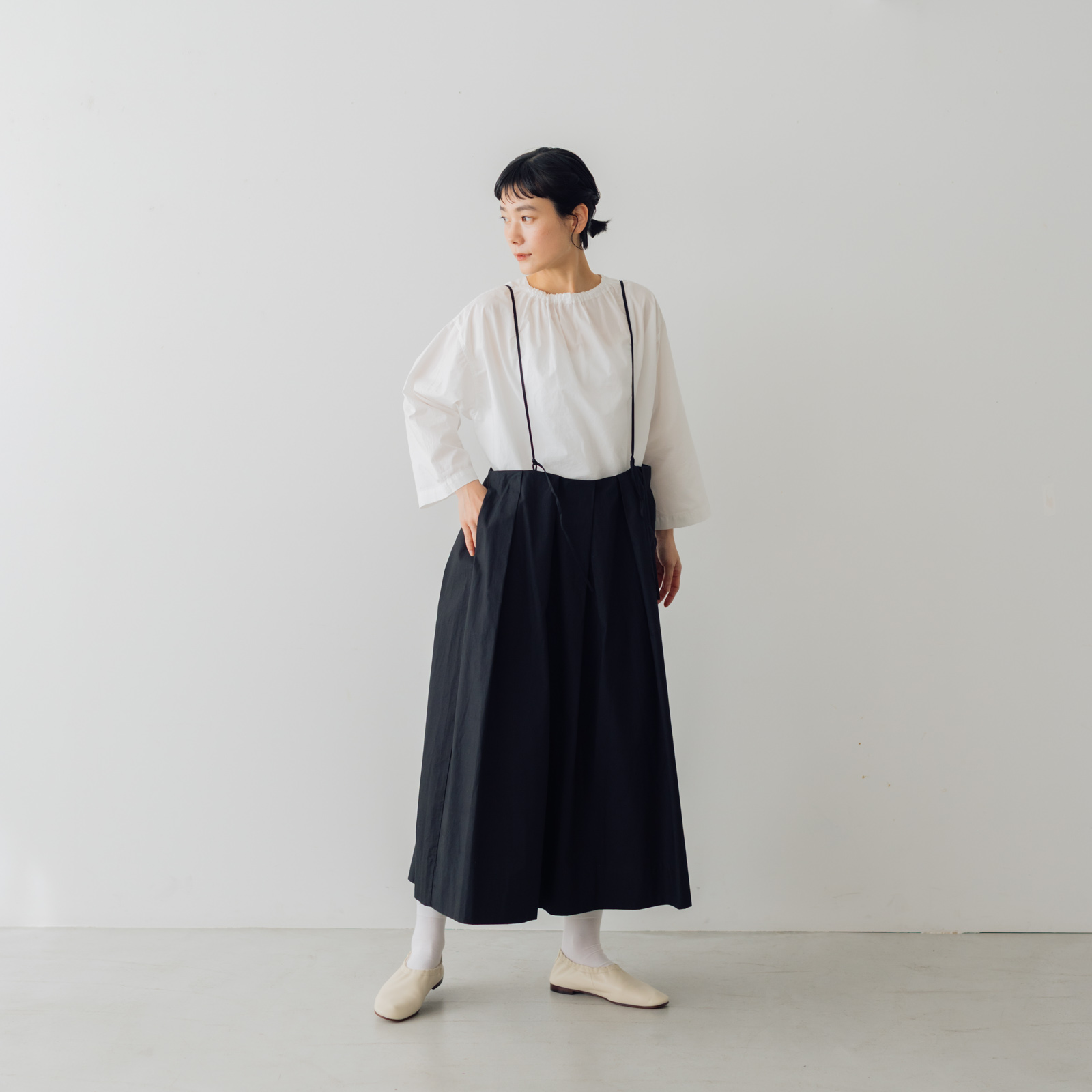 華奢なショルダーストラップと、タックのボリューム感とのバランスがかわいく、これ1枚でサマになる人気スカート。今季は、シックなブラックと、アイボリーカラーが爽やかなオイスターが登場です。