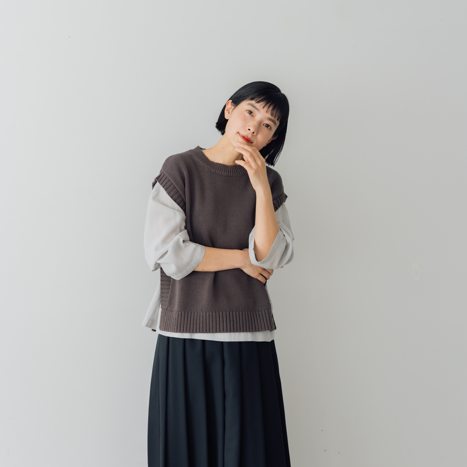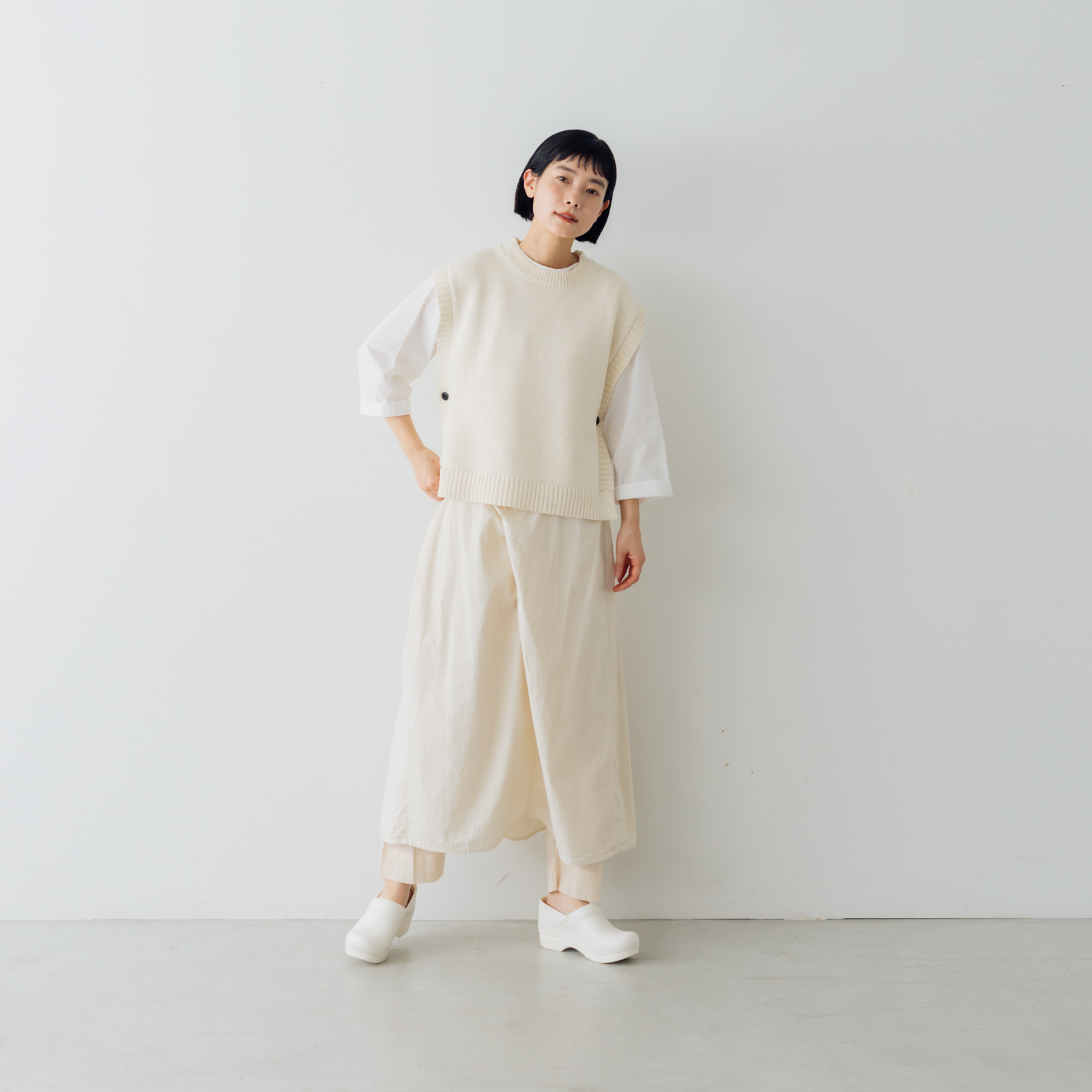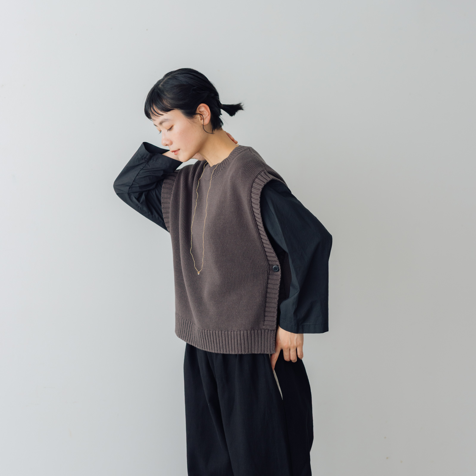 シンプルなカットソーにデニムやロングスカート、という定番コーディネート。からだにも馴染んでいていて、気持ちも落ち着く。でも何か足りないような‥そんな時のプラスワンアイテムとして、いつものスタイリングをアップデートしてくれ、ひとさじの変化をもたらす「くらすこと コットンニットベスト」。