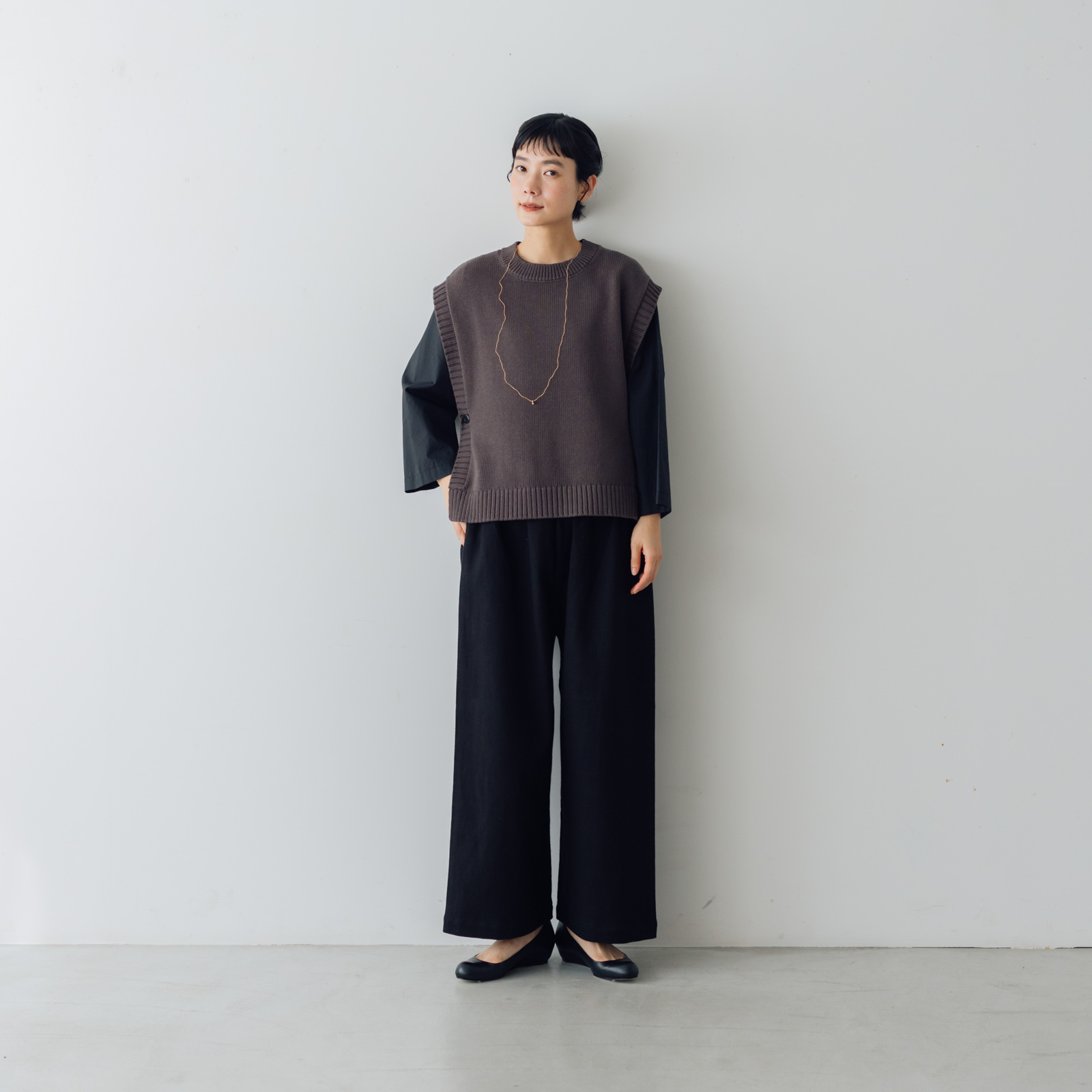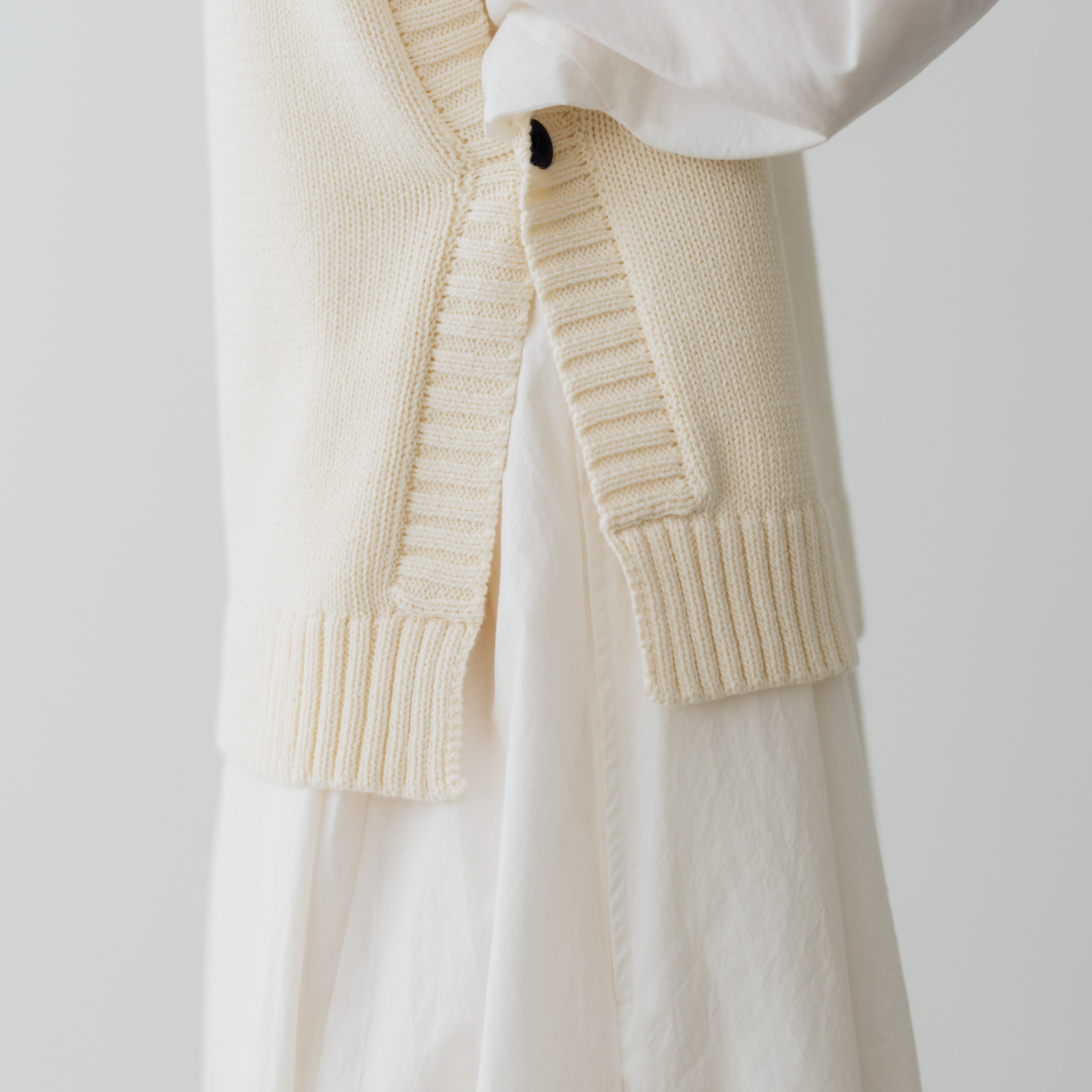 ポイントは両サイドのスリット。裾に動きが出て軽やかで抜け感が出るので、レイヤードしても着膨れせずすっきり見えます。少し大きめのボタンもアクセント。