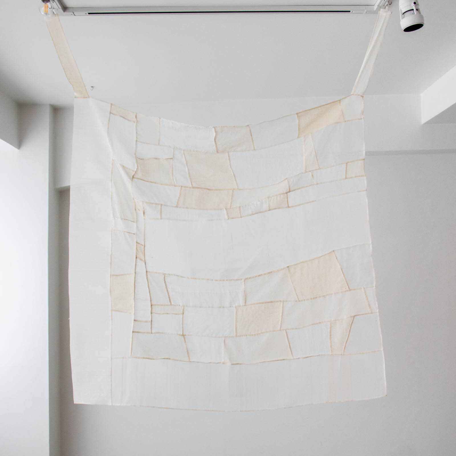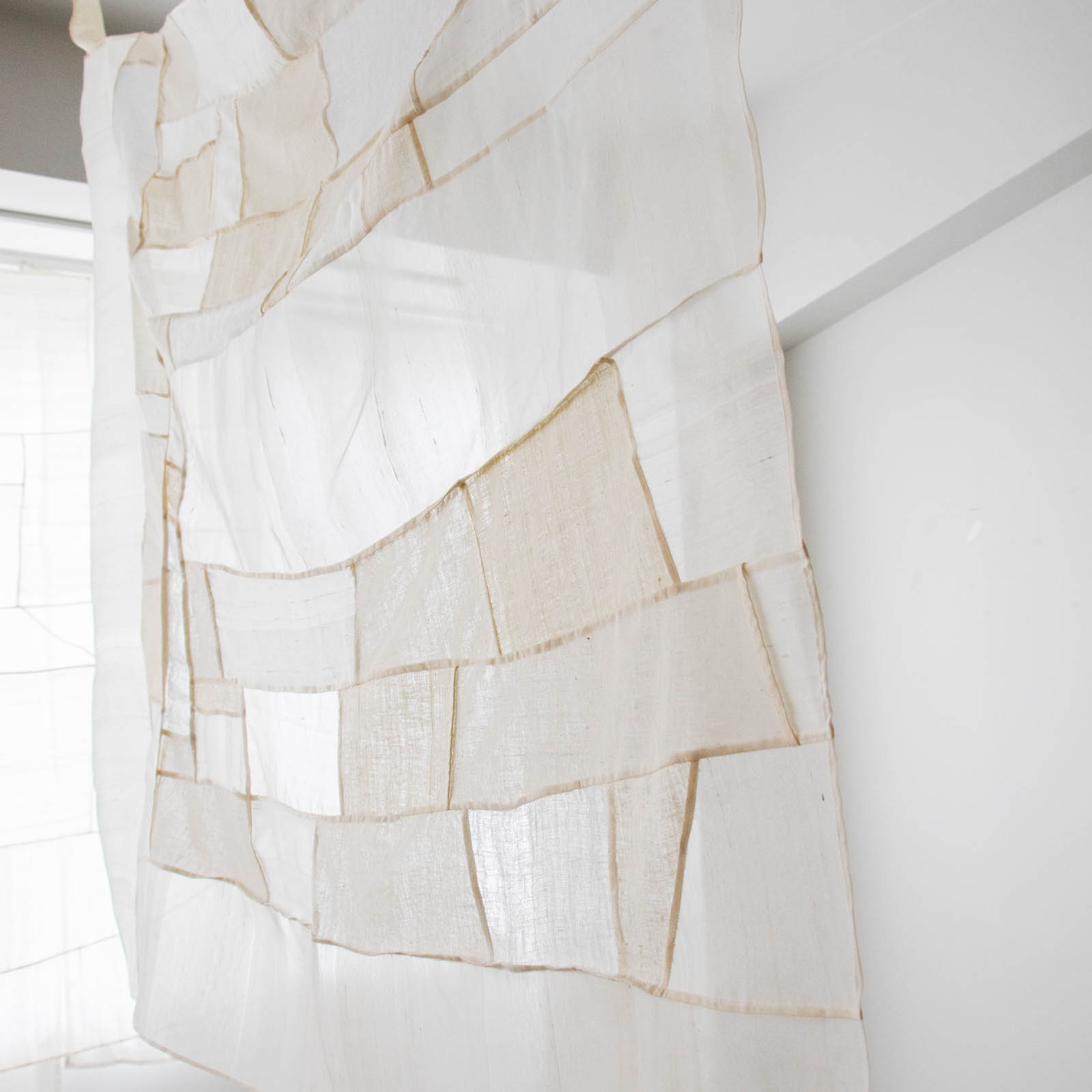 そしてこのクロスの特徴のひとつが、上部二か所に付けられた帯状の布。耳のように伸びるその帯を使って吊るすことで、一枚の布が立体的に空間へと開いていきます。