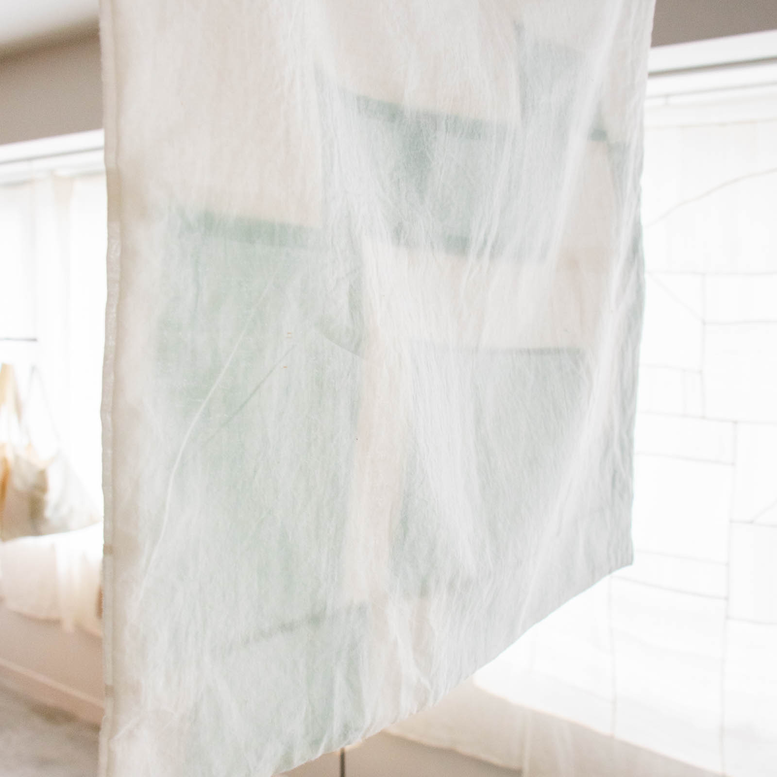 窓辺や壁に吊るし、光を含ませながら楽しんでいただくのがおすすめです。時間や天候によって表情が変わり、空間にやわらかな気配を生み出します。白とブルーのコントラストをお楽しみください。