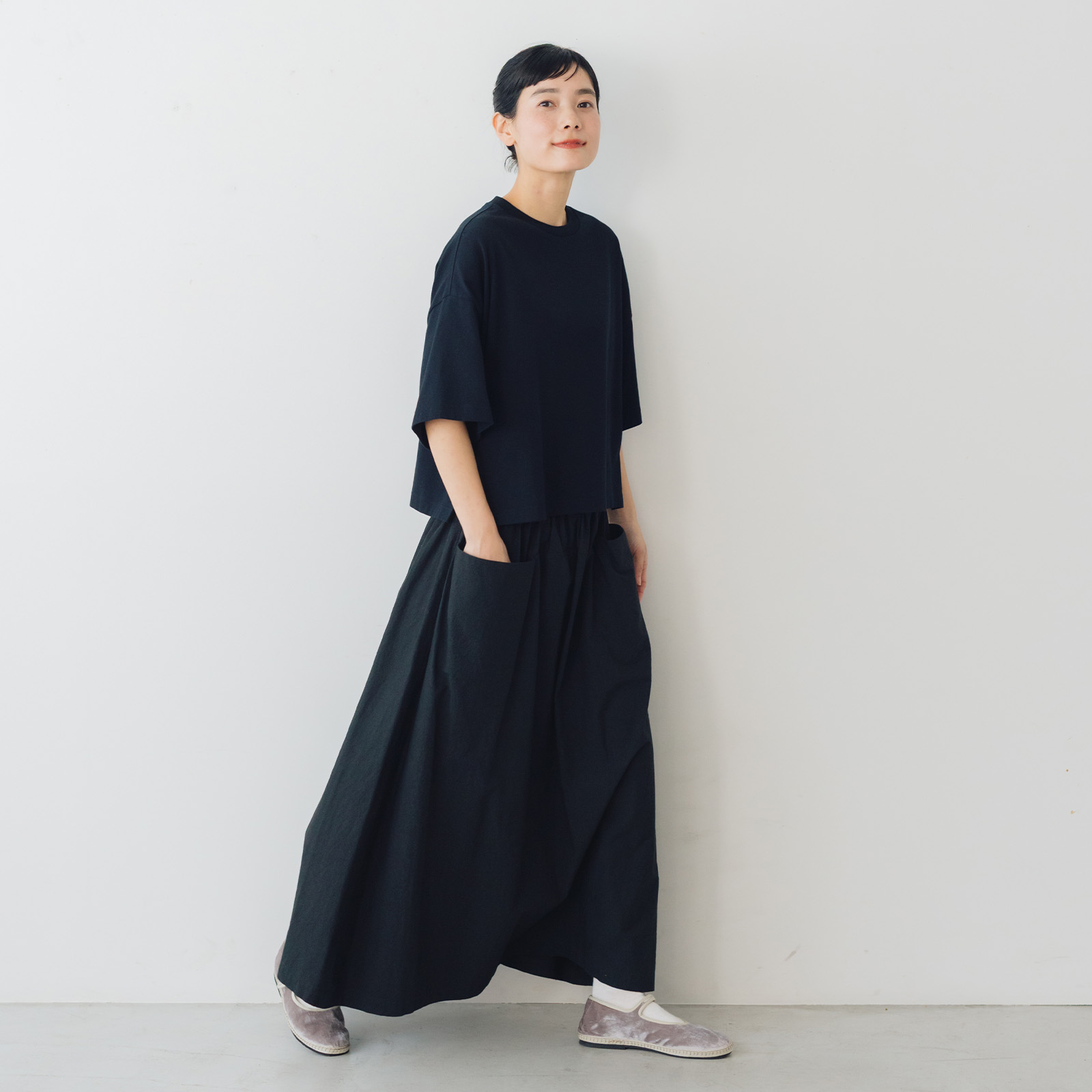 使用しているのは、高密度で適度なハリのあるコットン。職人さんが手作業で染色、天日干しをすることにより生まれる独特のムラ感やシワ感が、プレーンなロングスカートを風合いを豊かにしています。