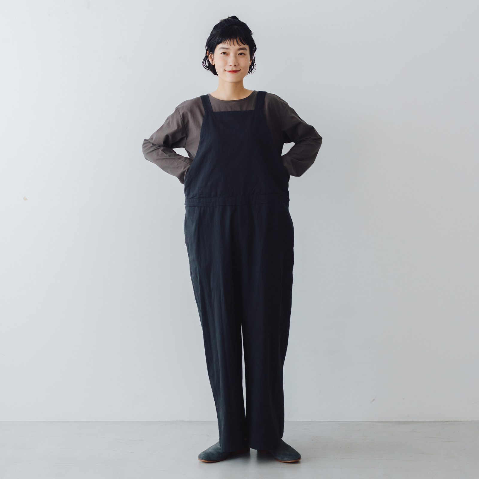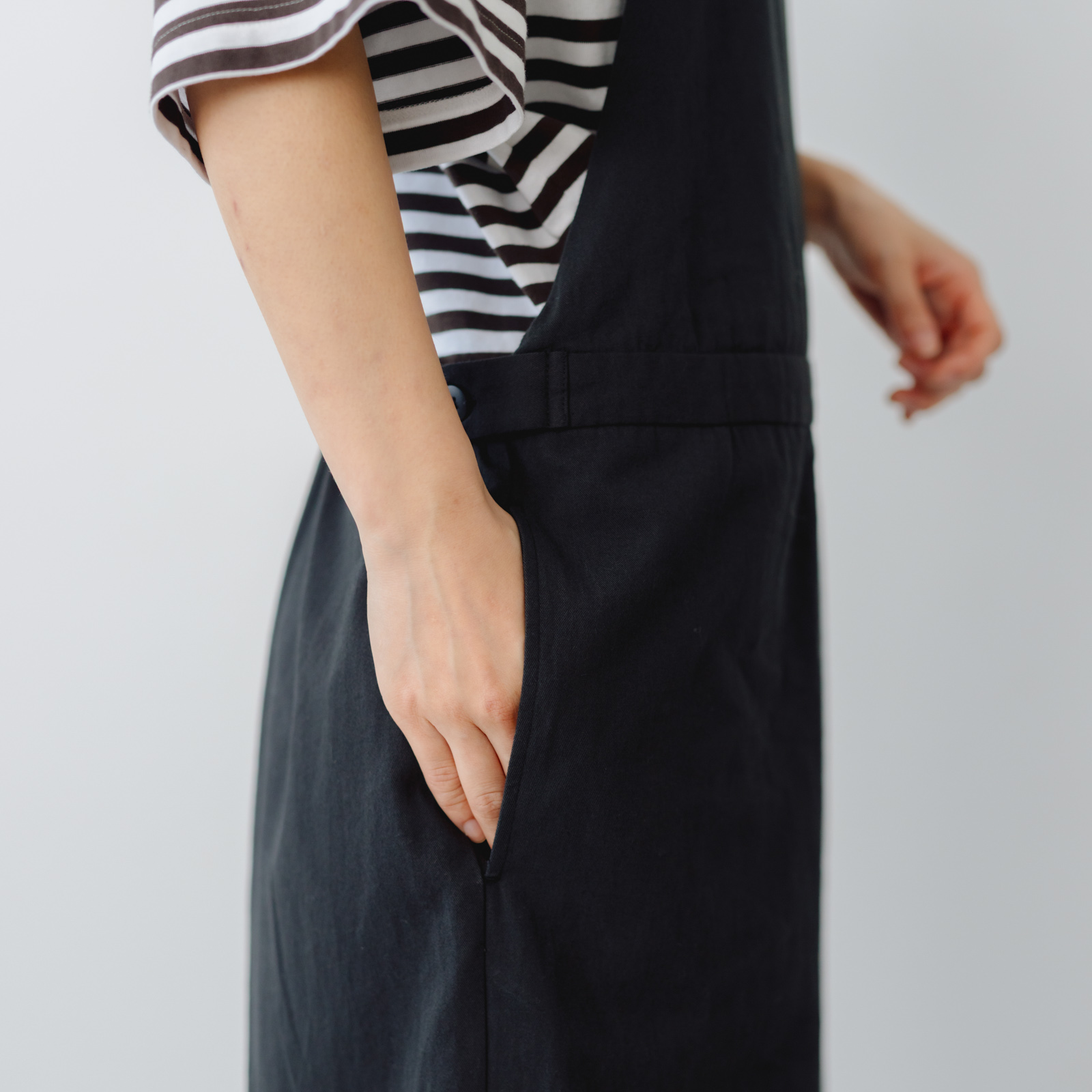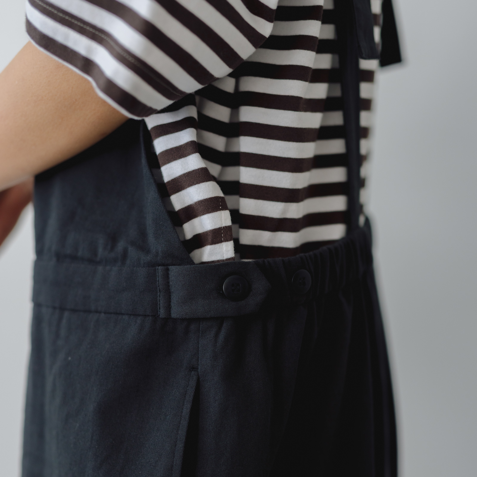 サイドにタブをつけてシルエットの変化を可能にしたことで、ゆるくワーク感のイメージ強いサロペットのフォルムにメリハリがつけられるよう工夫しました。