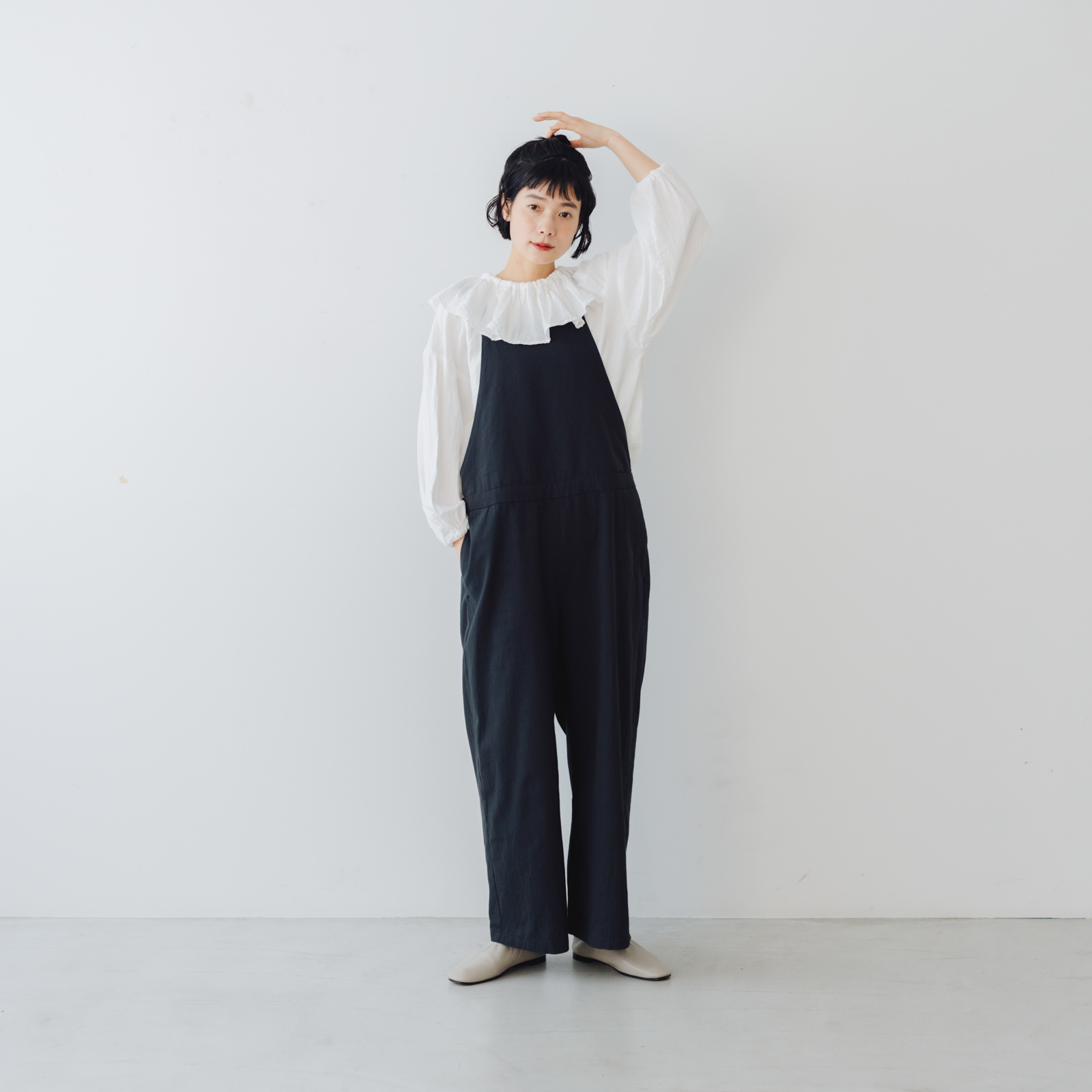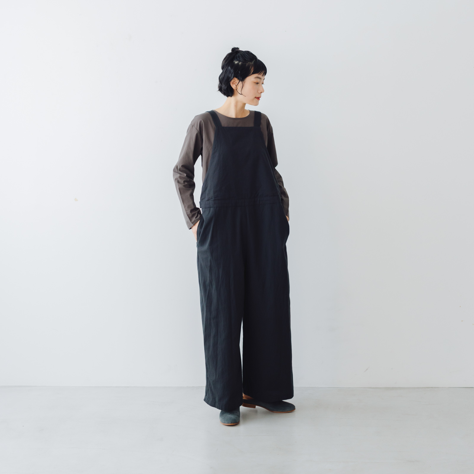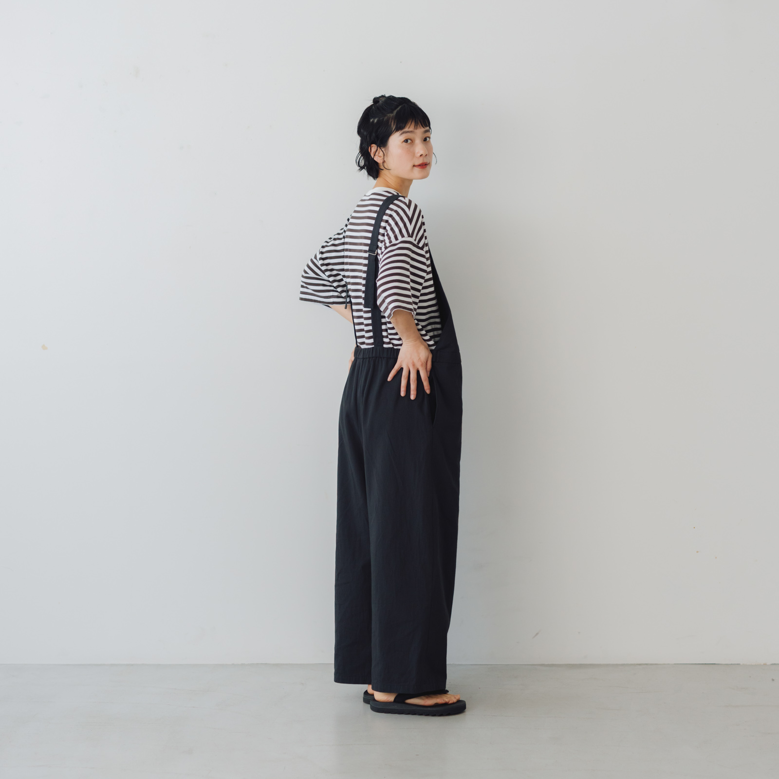 サイドにタブをつけてシルエットの変化を可能にしたことで、ゆるくワーク感のイメージ強いサロペットのフォルムにメリハリがつけられるよう工夫しました。