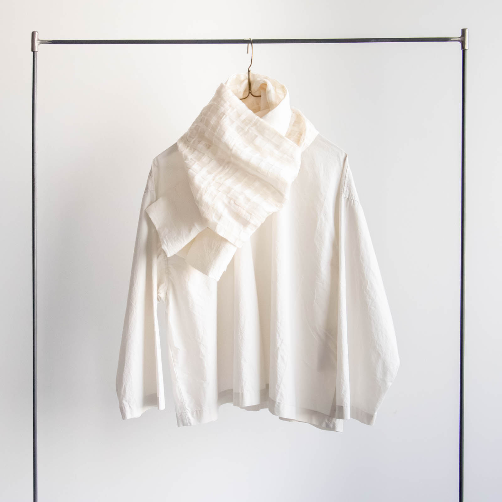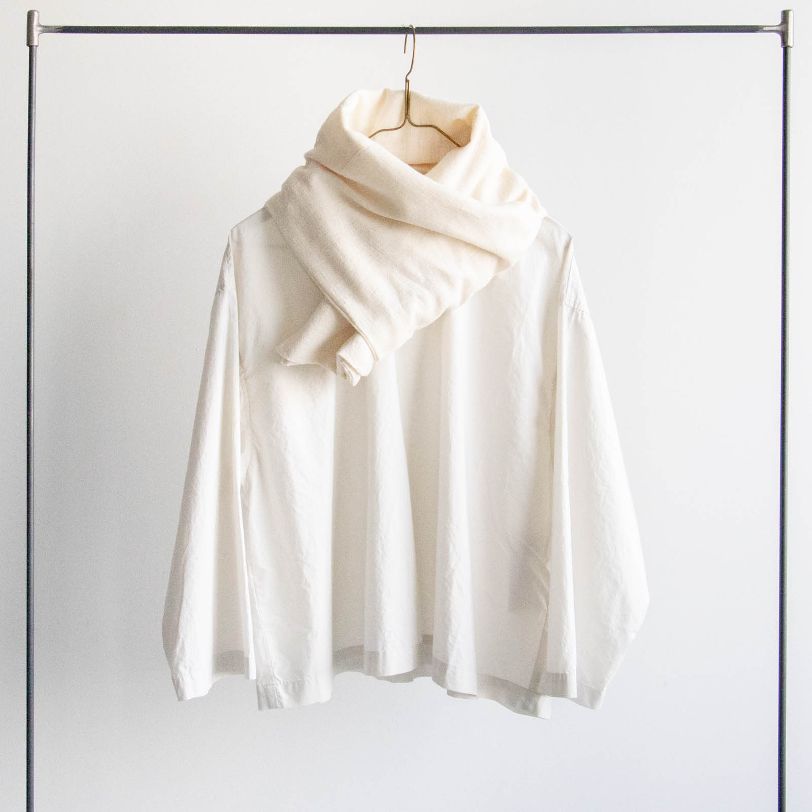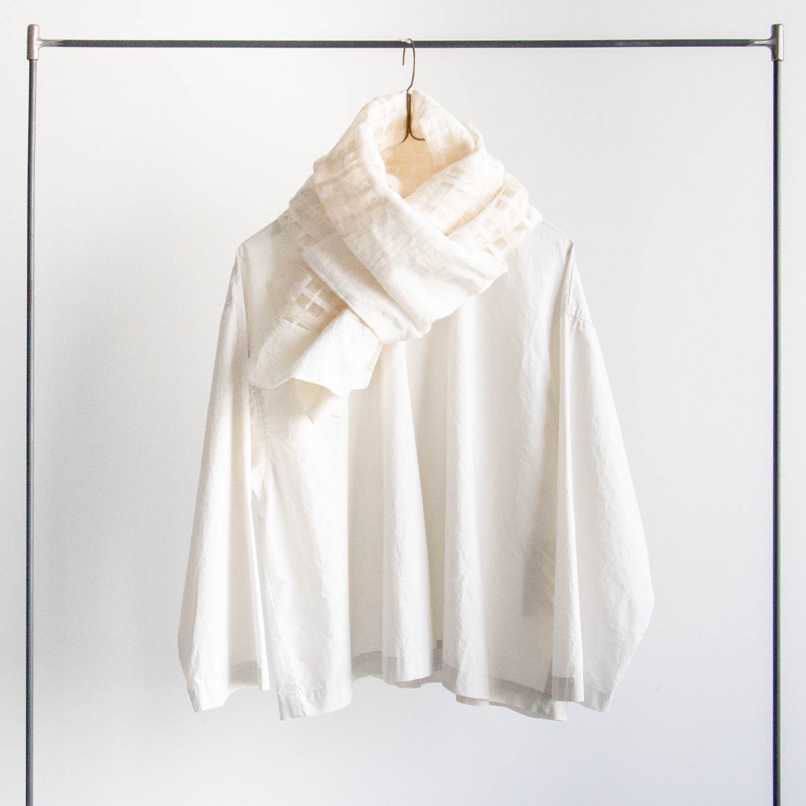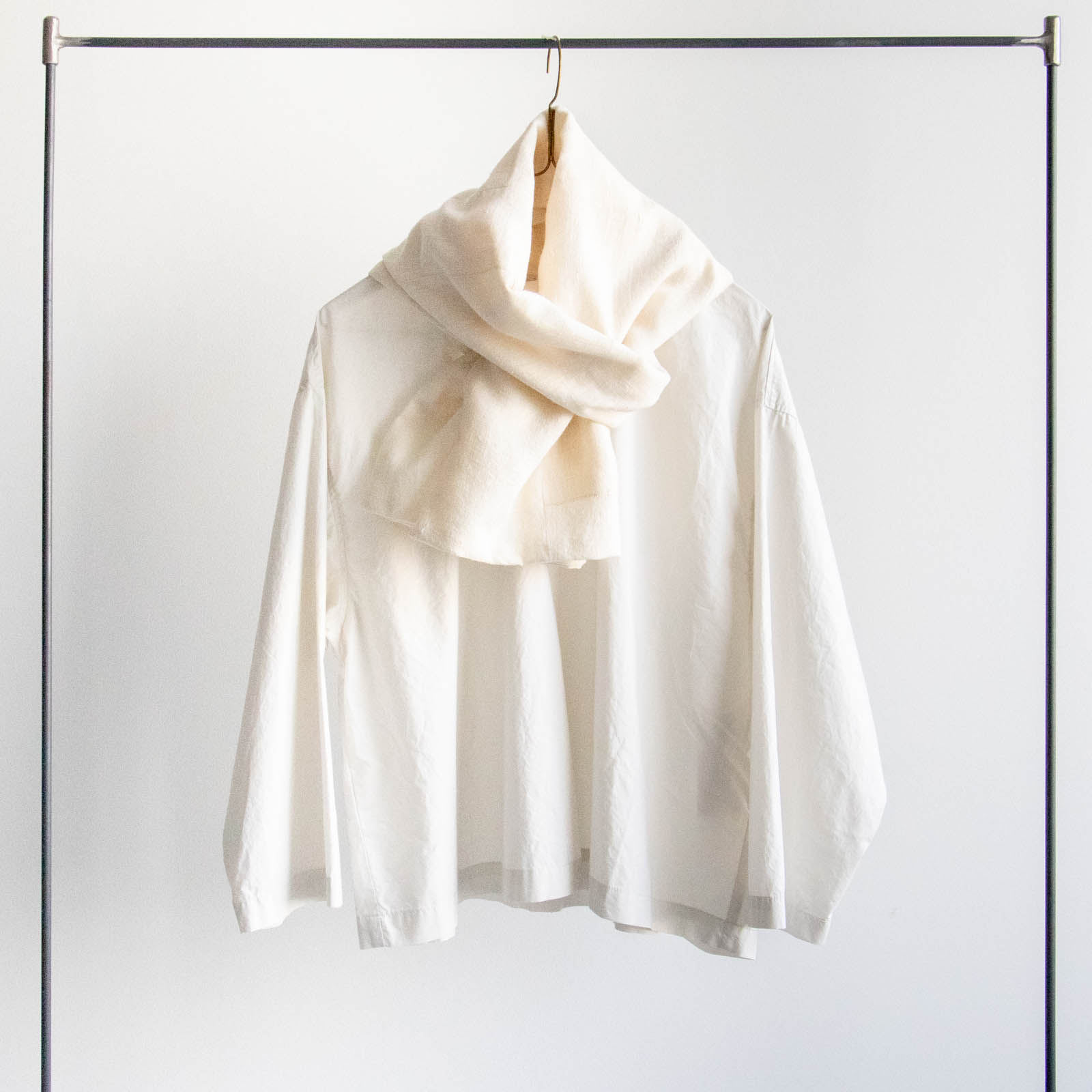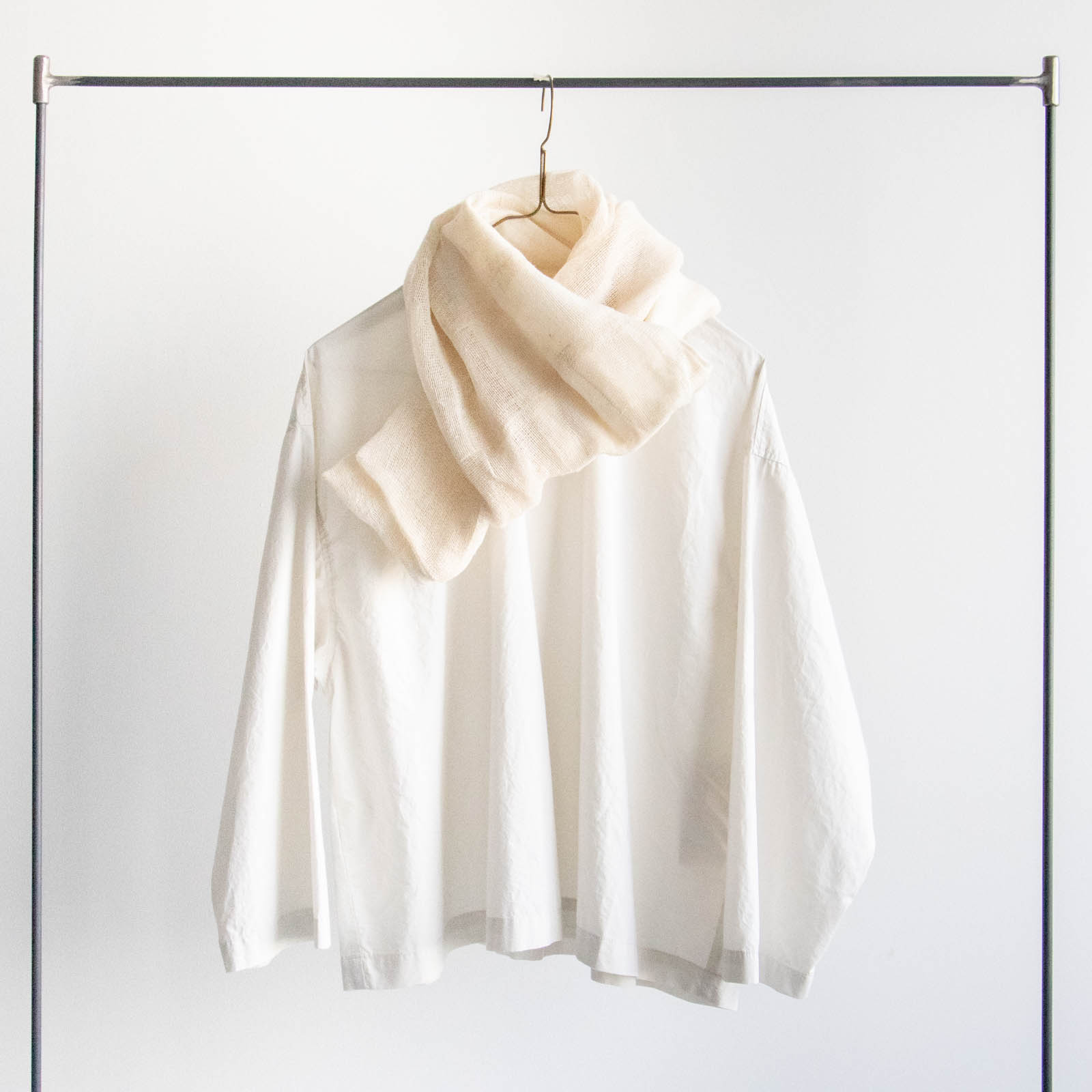 首元に巻いたり、首元に巻いたり、アウターの襟元から垂らしてコーディネートのアクセントとして、軽やかに使えるストールです。