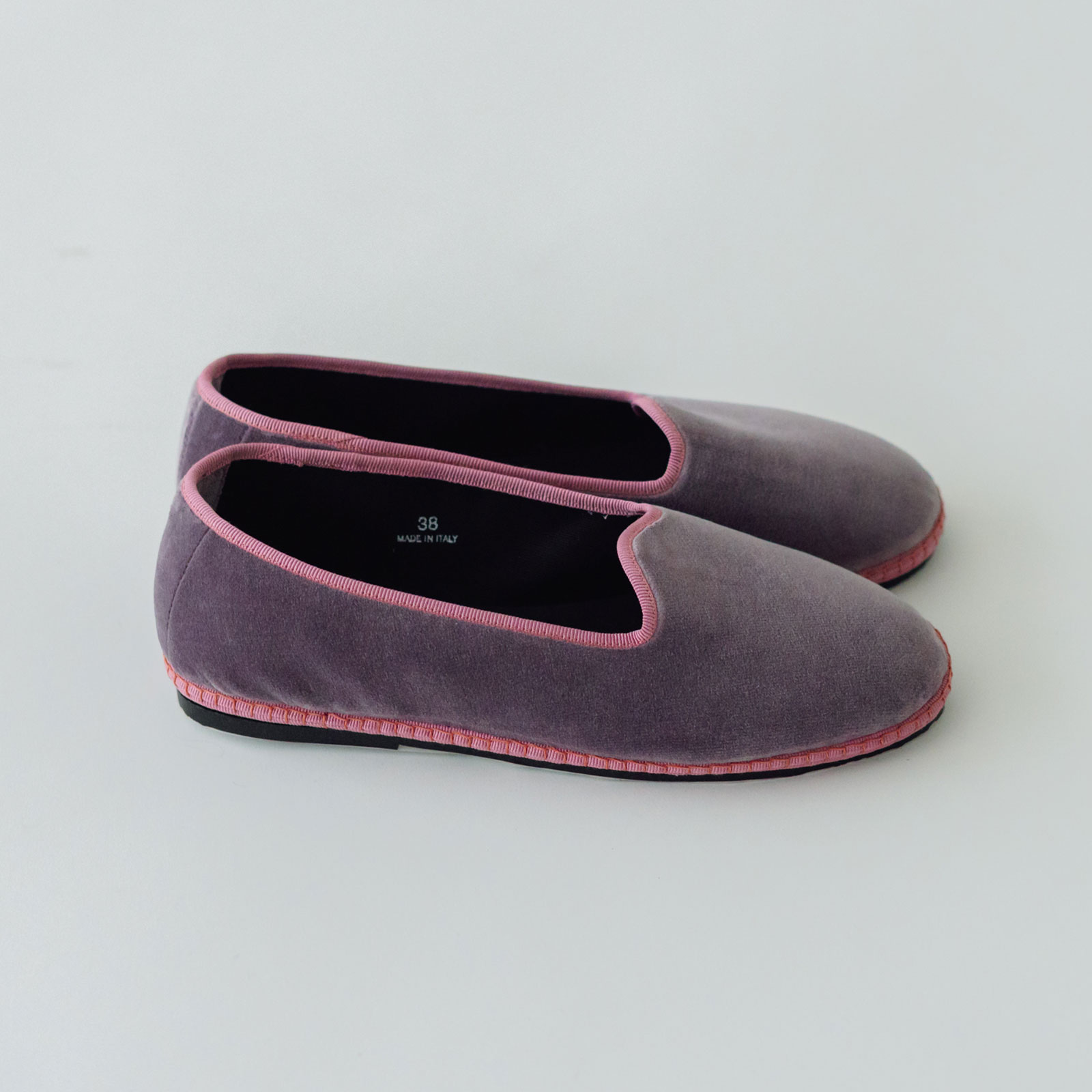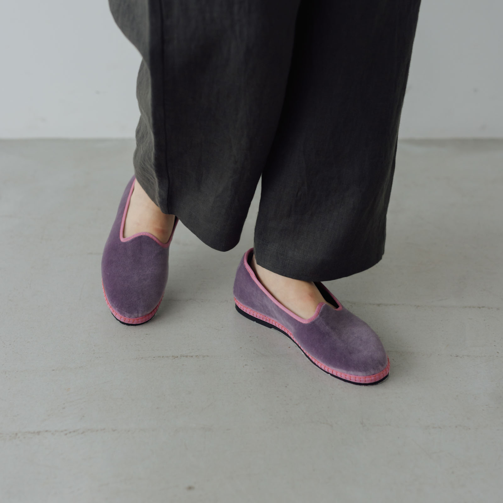 イタリアの靴職人がハンドメイドで縫い上げて作る「Sciuscià(シューシャ)」のフラットシューズ。こちらはスリッポンタイプの「TRAGARA」。ベルベットの起毛した、くたっとしたやわらかな生地で軽やかな履き心地です。