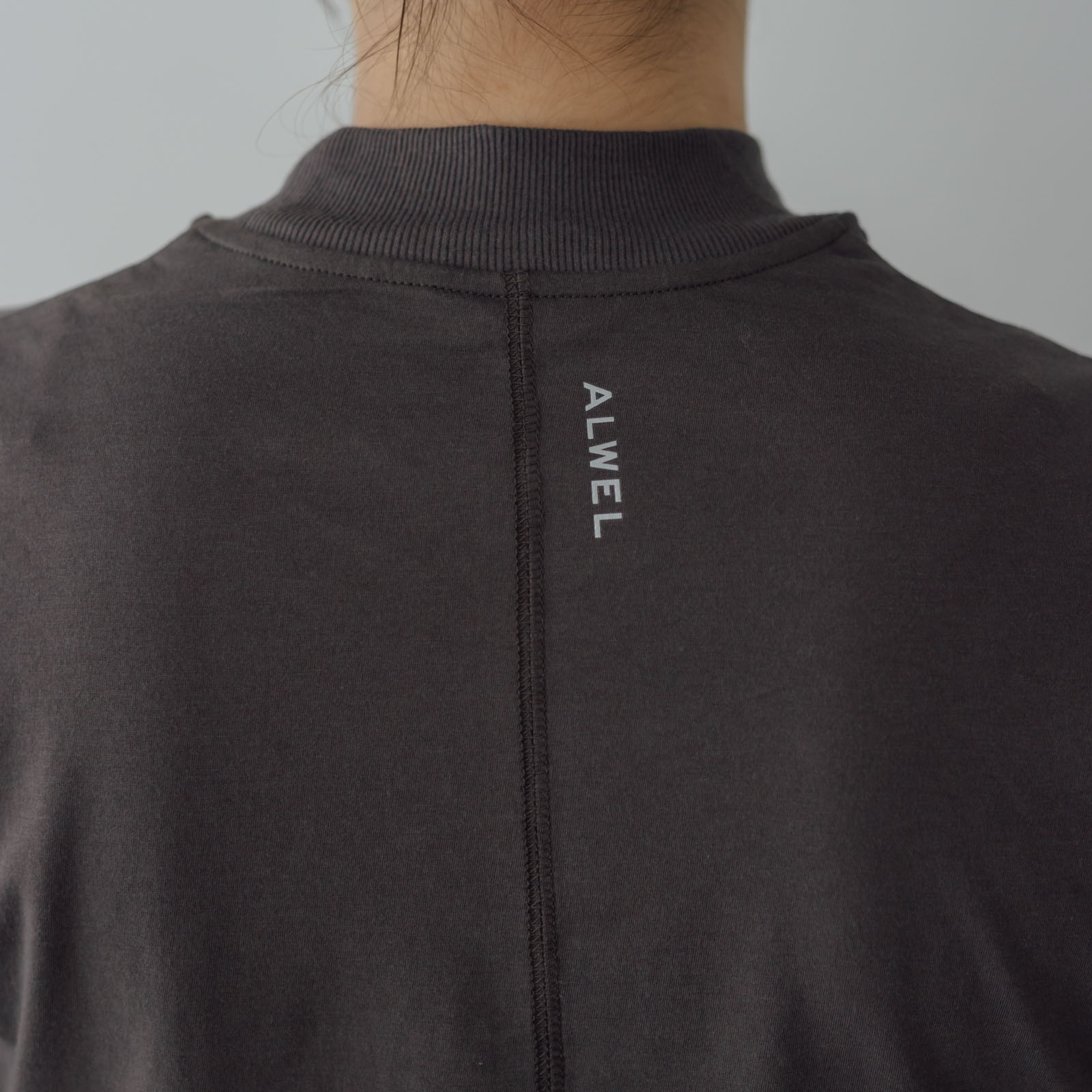 バックスタイルにもこだわりがあり、中心で縫い合わせたシームと首元の'ALWEL'のロゴがデザインのポイント。