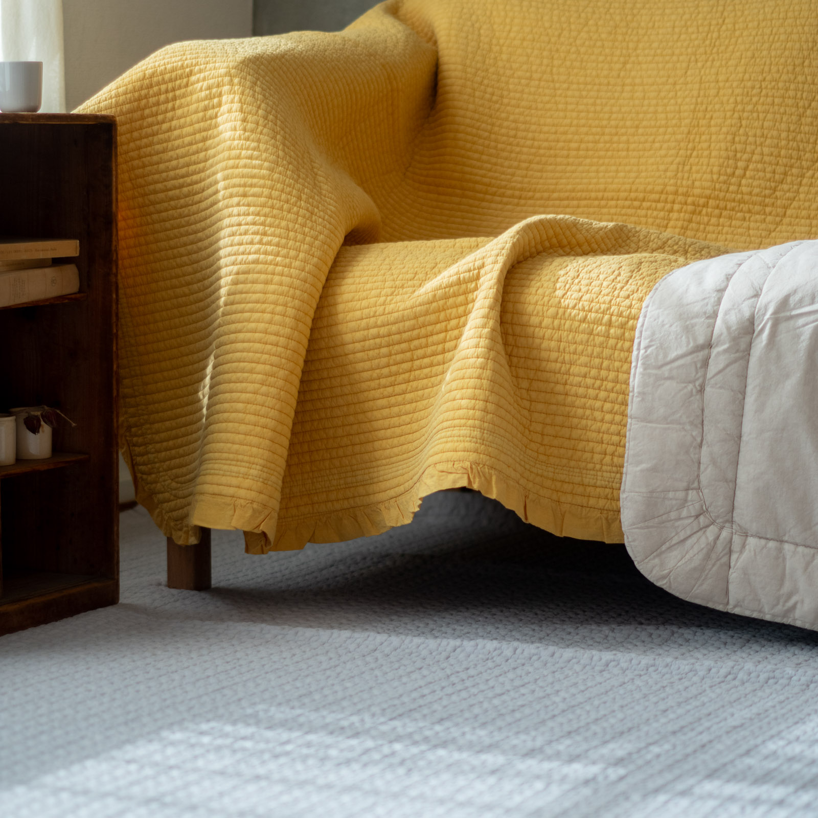 こちらのストライプイブルは、ドットイブルと比べて、さらっと軽やかな肌ざわり。中綿入りでほどよいクッション性があり、フローリングに敷いてラグとして使うのもおすすめです。上掛けやカバーとしても、日常に取り入れやすい一枚です。