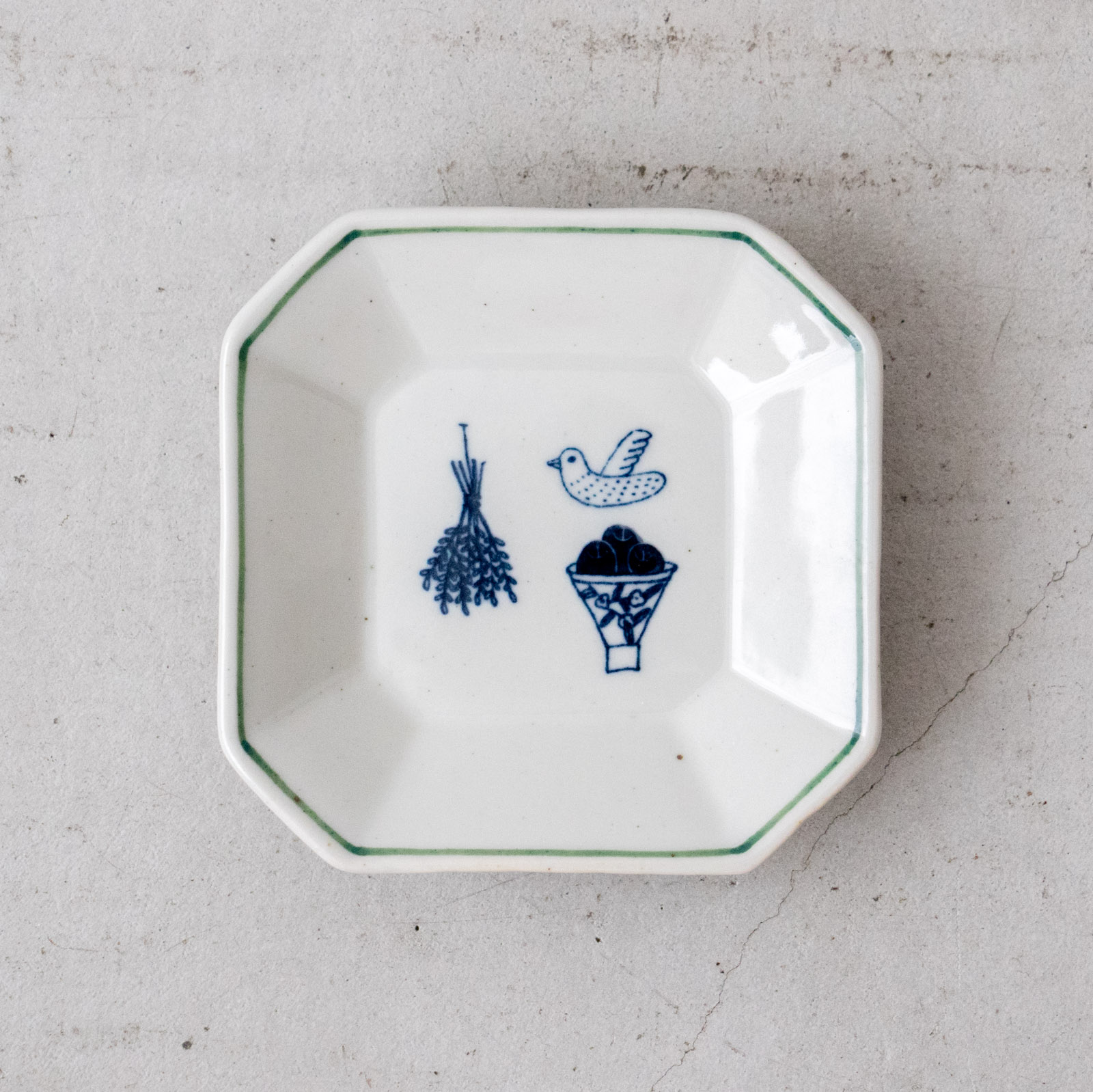 少し深さのある変形八角形のお皿は、シャープさと愛らしさを兼ね備えたデザイン。デザート皿として使うのにちょうどよい大きさで、ちょっとしたおかずやフルーツにもおすすめです。どこか懐かしく、まるで昔から持っていたかのような、レトロな雰囲気のお皿です。