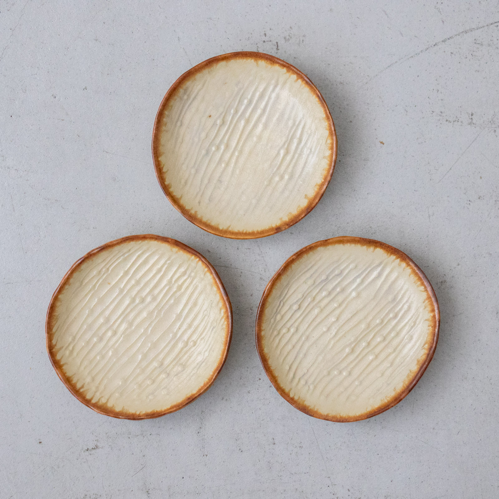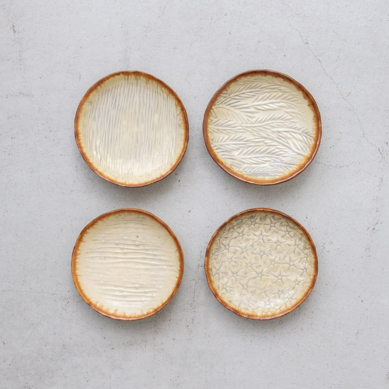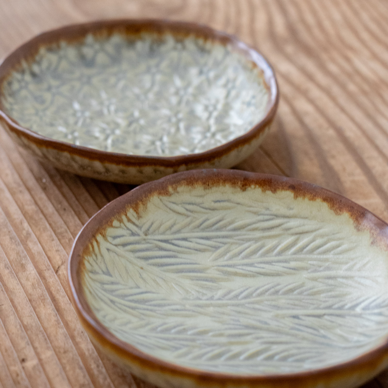 ベージュやグレーなど、くぼみに釉薬が溜まることで濃淡が生まれ、模様によってさまざまな表情を見せてくれます。縁にほどこされた、キャラメルのようなやわらかな色合いも魅力です。