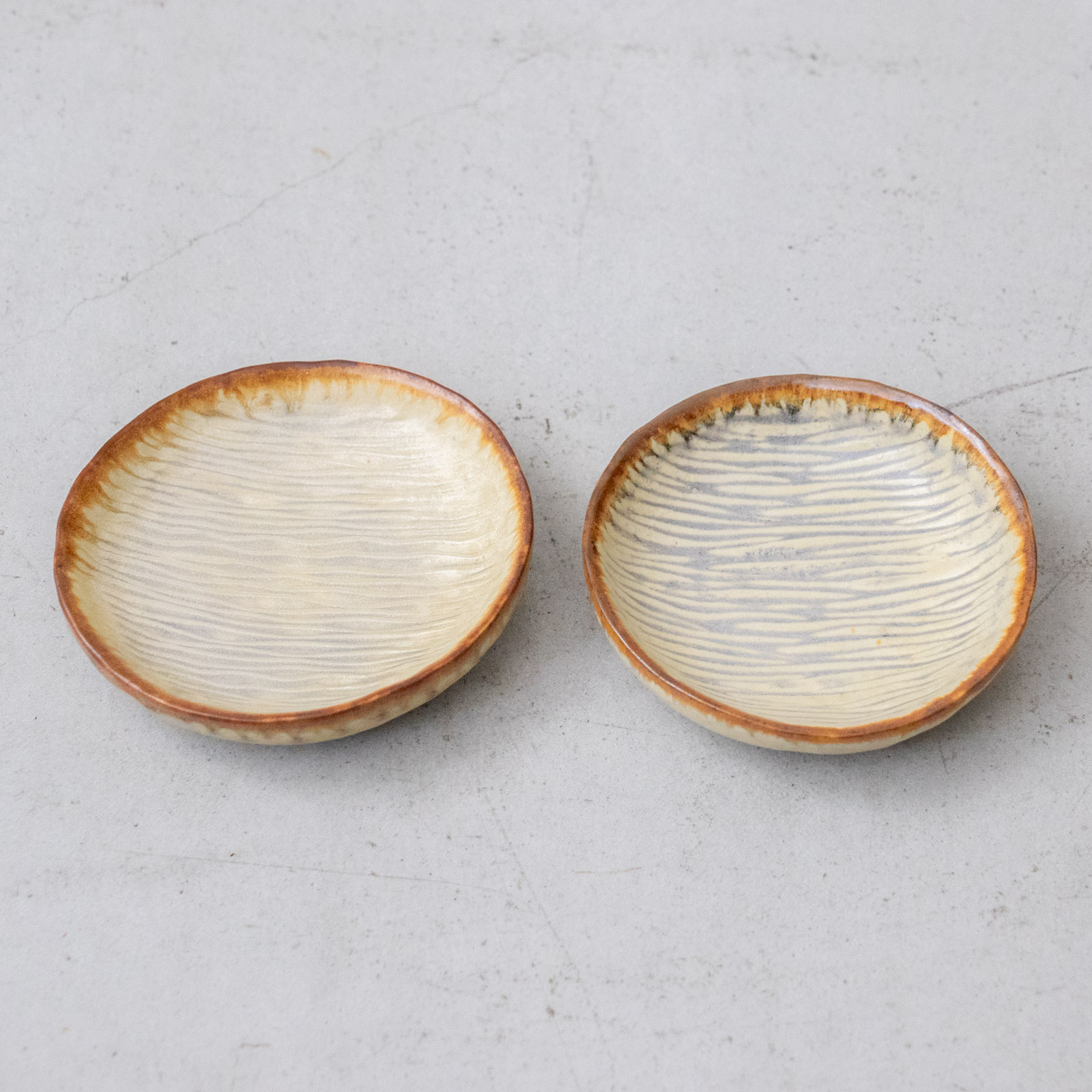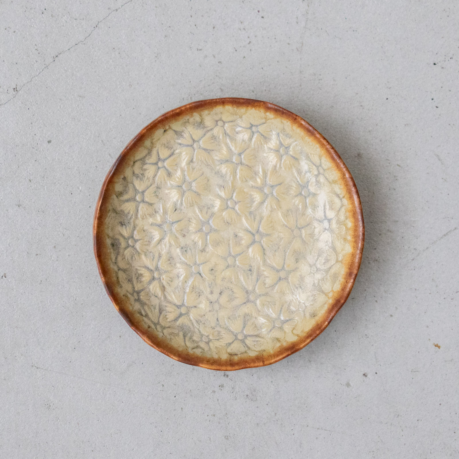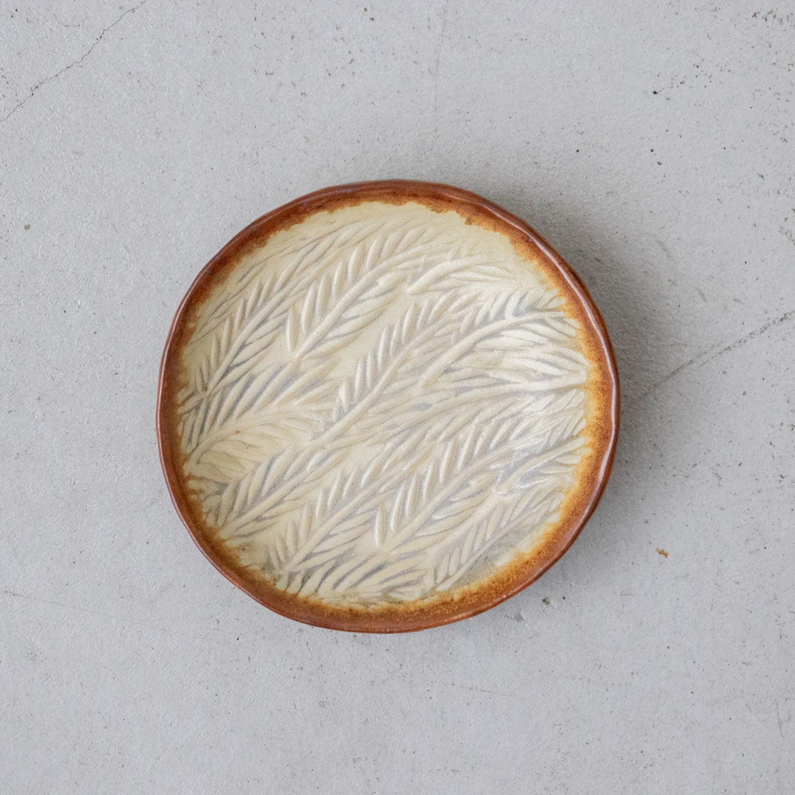 ベージュやグレーなど、くぼみに釉薬が溜まることで濃淡が生まれ、模様によってさまざまな表情を見せてくれます。縁にほどこされた、キャラメルのようなやわらかな色合いも魅力です。