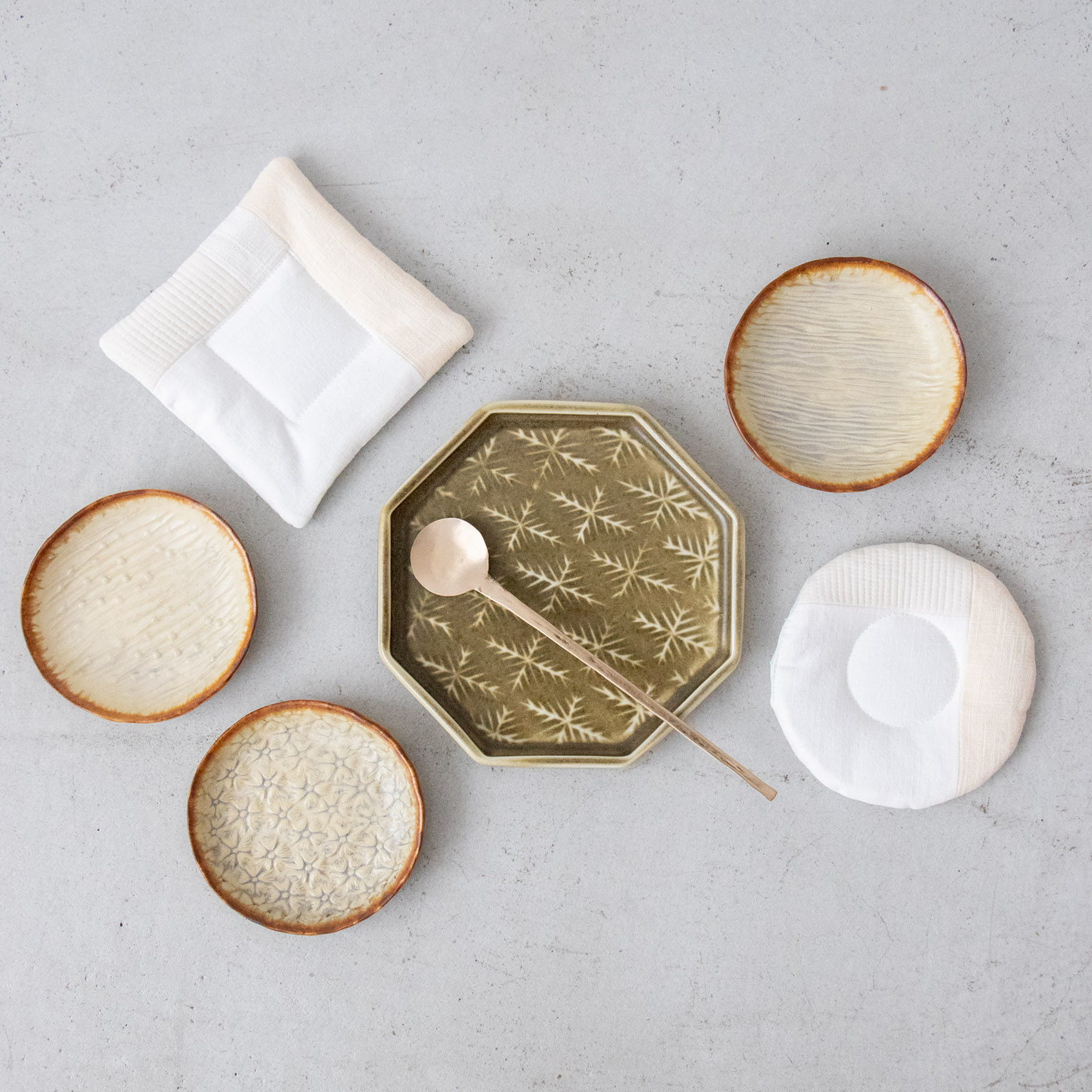 雪花皿(中央)や、ヌビのコースターとあわせて。韓国の趣を感じる、あたたかな食卓に。