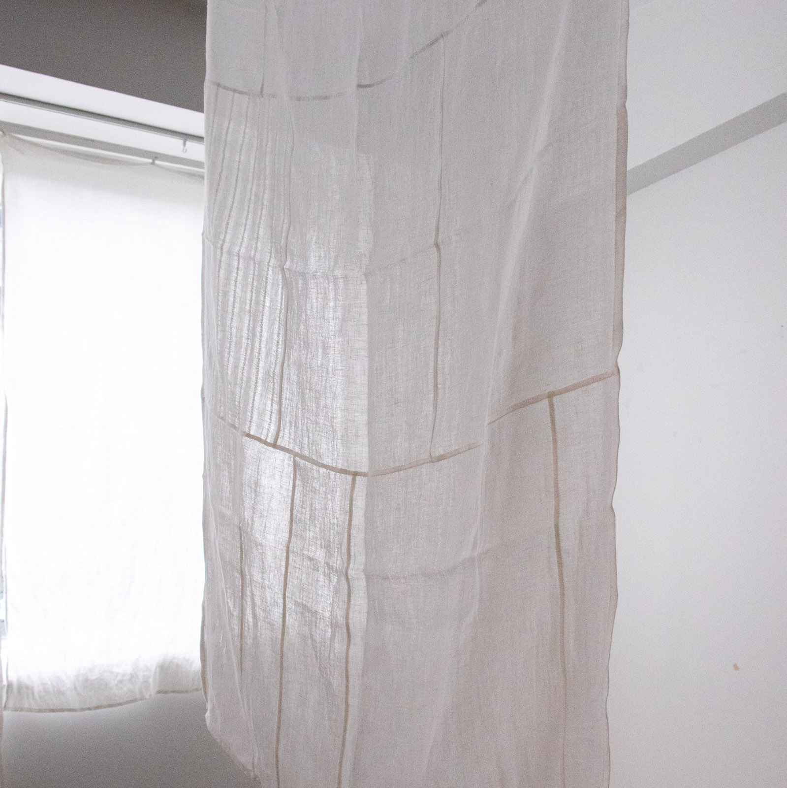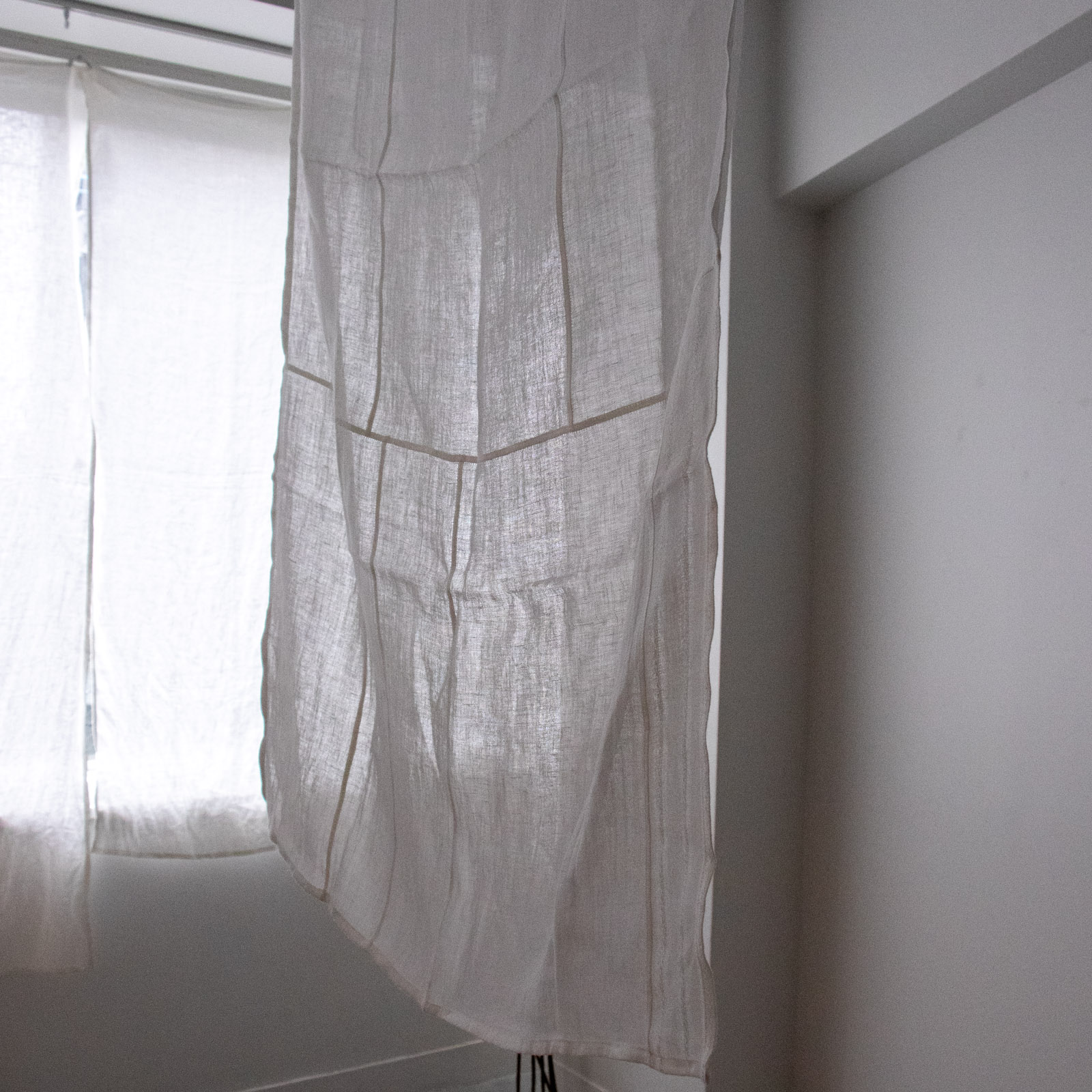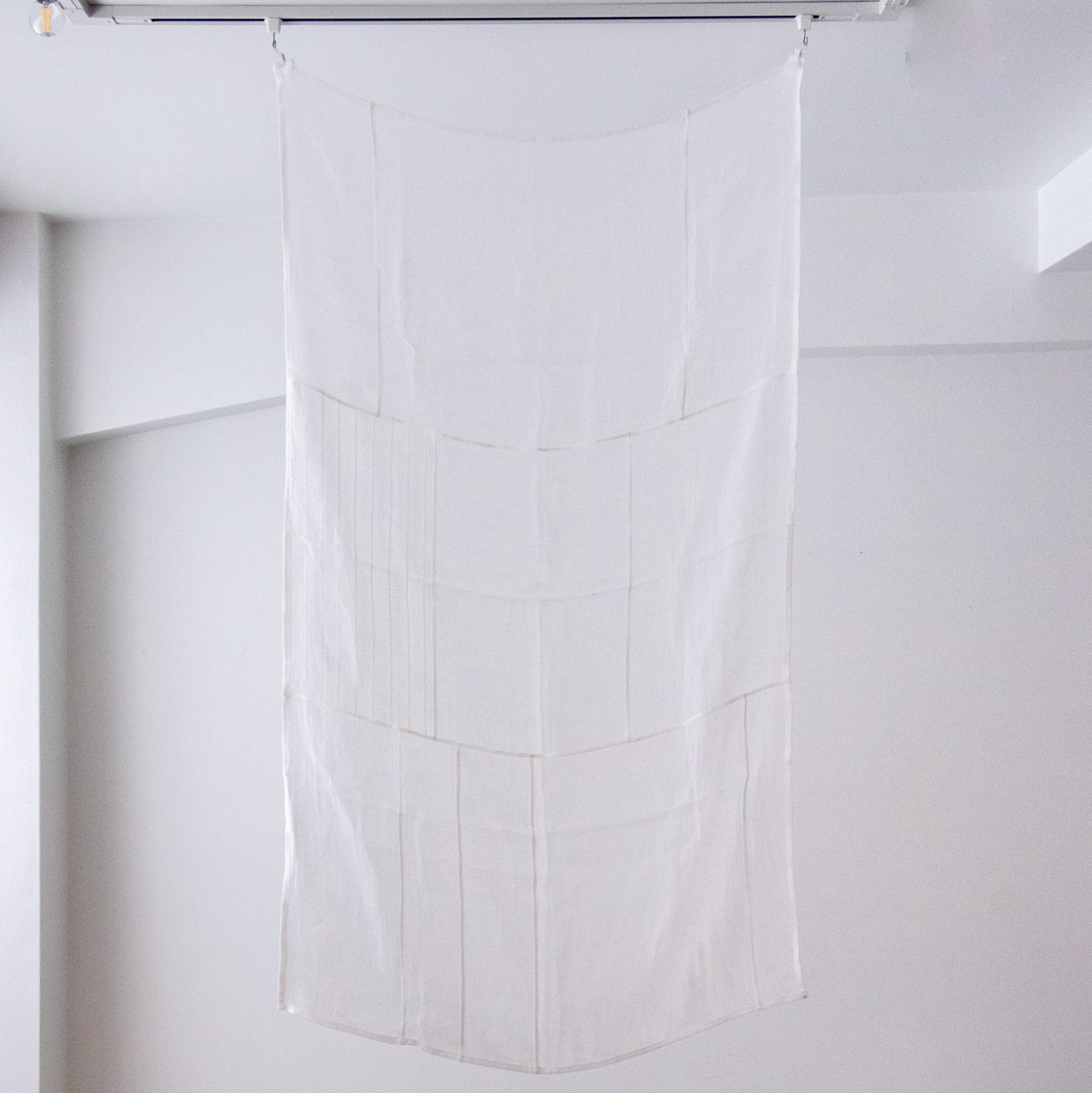 伝統的なポジャギの技法を受け継ぎながら、布には強いこだわりでリトアニア産のリネンを使用。ミシンで丁寧に縫われた直線が、布と布の重なりをくっきりと浮かび上がらせ、光の当たり方によって陰影が変わります。シンプルなのに、じっと見ていると奥行きが生まれてくる。洗うほどに柔らかくなり、時間とともに自然なしわも愛おしくなっていく素材です。