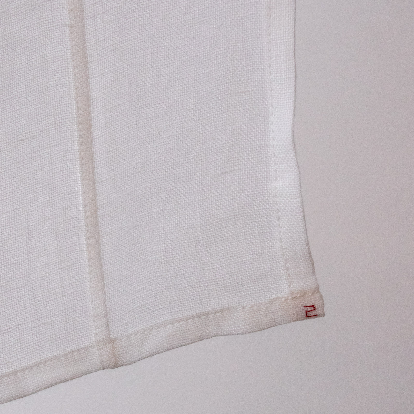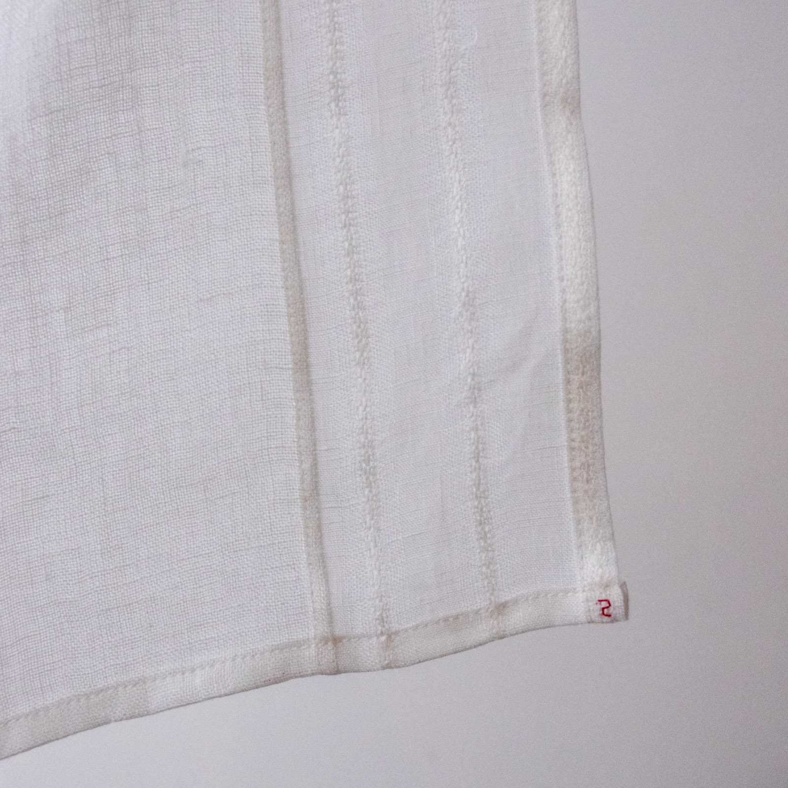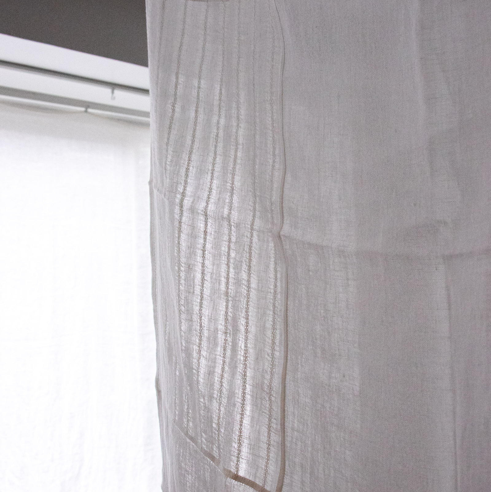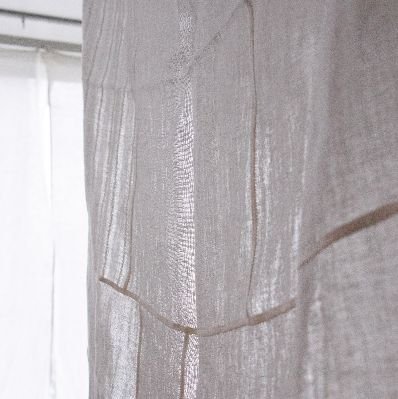 伝統的なポジャギの技法を受け継ぎながら、布には強いこだわりでリトアニア産のリネンを使用。ミシンで丁寧に縫われた直線が、布と布の重なりをくっきりと浮かび上がらせ、光の当たり方によって陰影が変わります。シンプルなのに、じっと見ていると奥行きが生まれてくる。洗うほどに柔らかくなり、時間とともに自然なしわも愛おしくなっていく素材です。