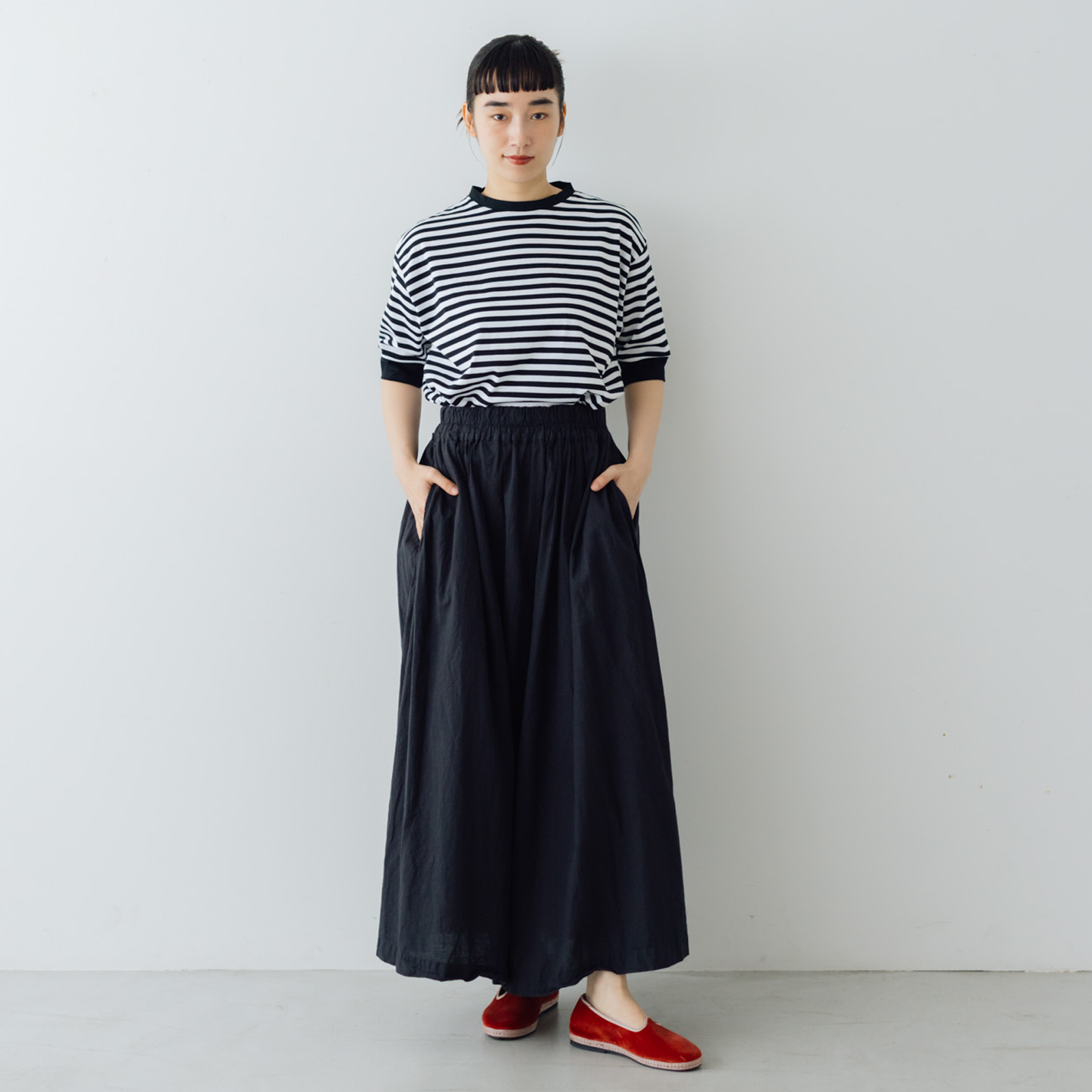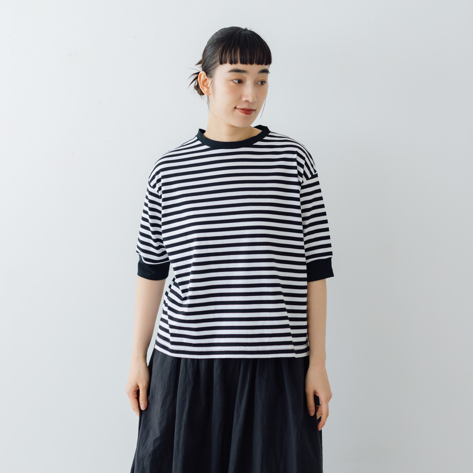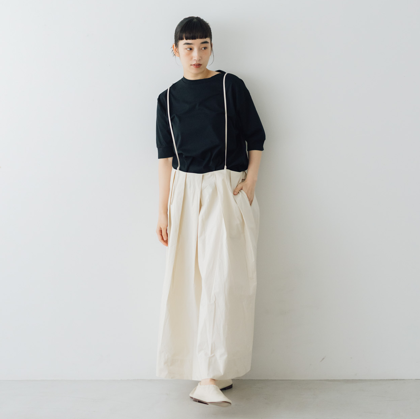 ほどよい厚みのある生地は、透けにくく、一枚でも安心感のある着心地。一枚ではもちろん、ジャケットやカーディガン、サロペットのインナーとしても重宝します。