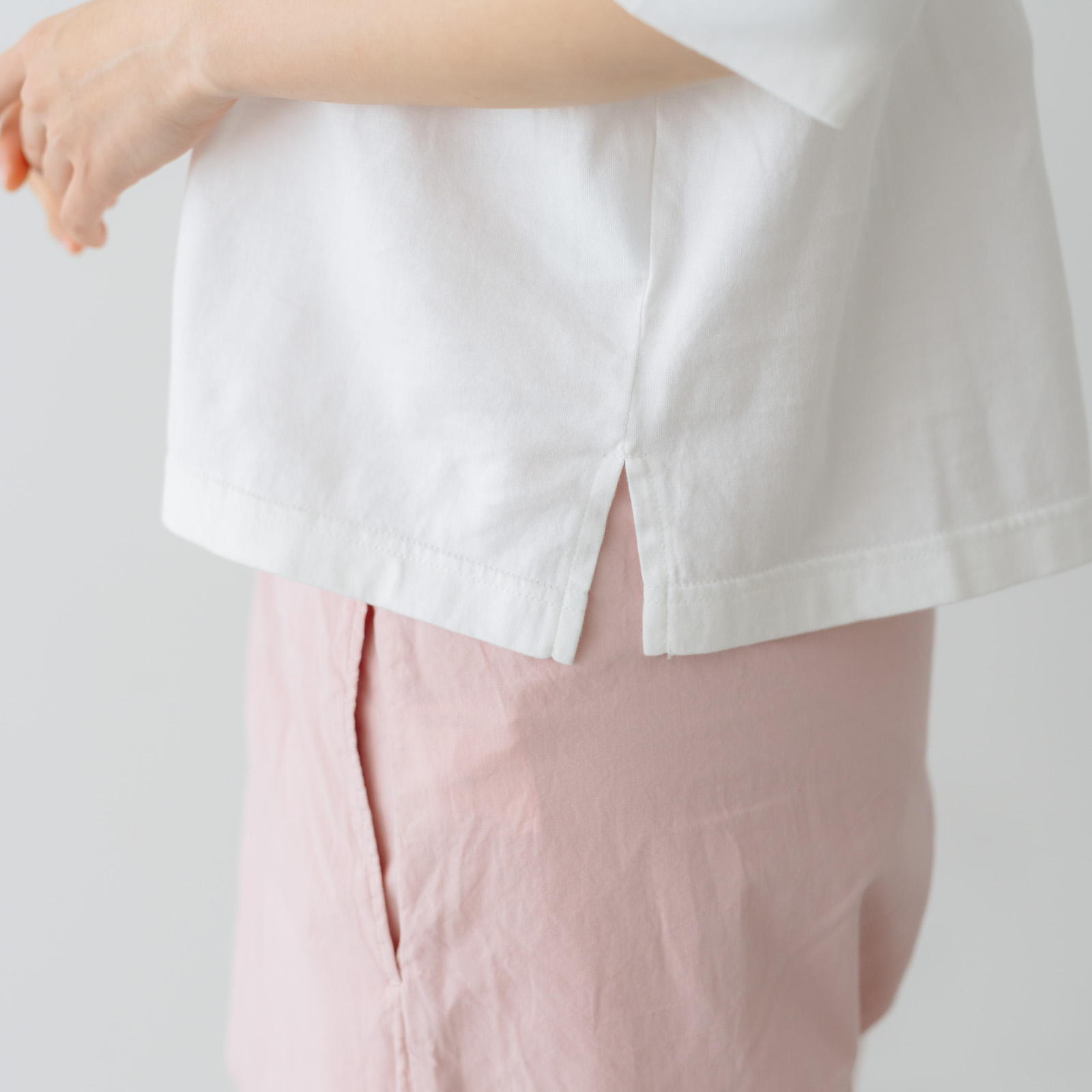 左右裾にあしらったスリットも、腰回りに抜け感をプラス。Tシャツのカジュアルな雰囲気も残しつつ、露出部分を少なめにした品のあるデザインが年齢を重ねたわたしたちにしっくりと馴染む一枚です。