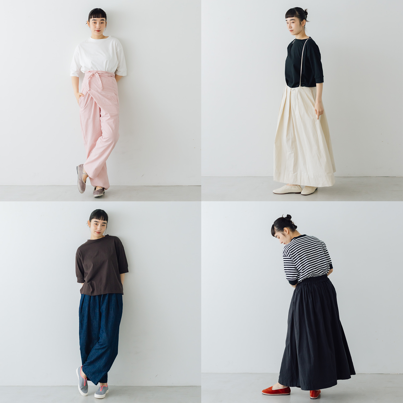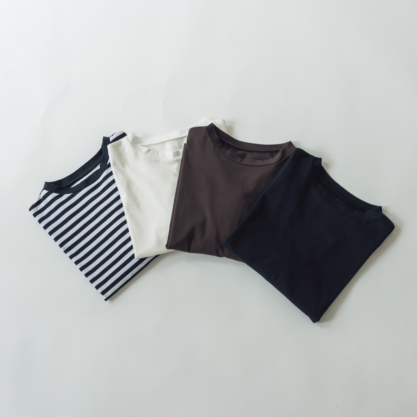 着まわしやすさにこだわった、全4色展開です。色もかたちも着回しやすいカットソーだから色違いで揃えて毎日の定番夏服に。
