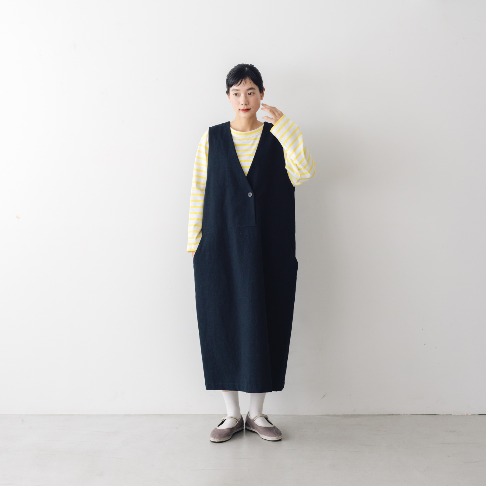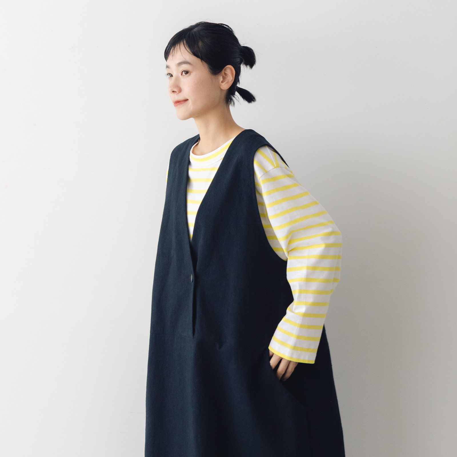 使用しているのは、程よいハリのあるコットン100%の天竺生地。それを「+homme(プラスオム)」という名前の通り、メンズサイズを参考に作られているので、ゆったりシルエットで仕立ててあり、リラックスした着用感です。