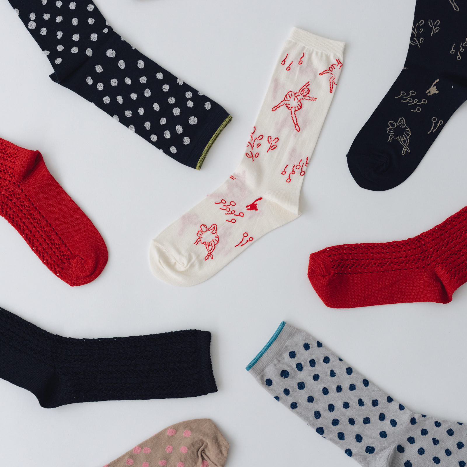 足元にこのソックスがあるだけで足取りが軽くなりそう!そんなウキウキした気持ちにさせてくれる靴下です。