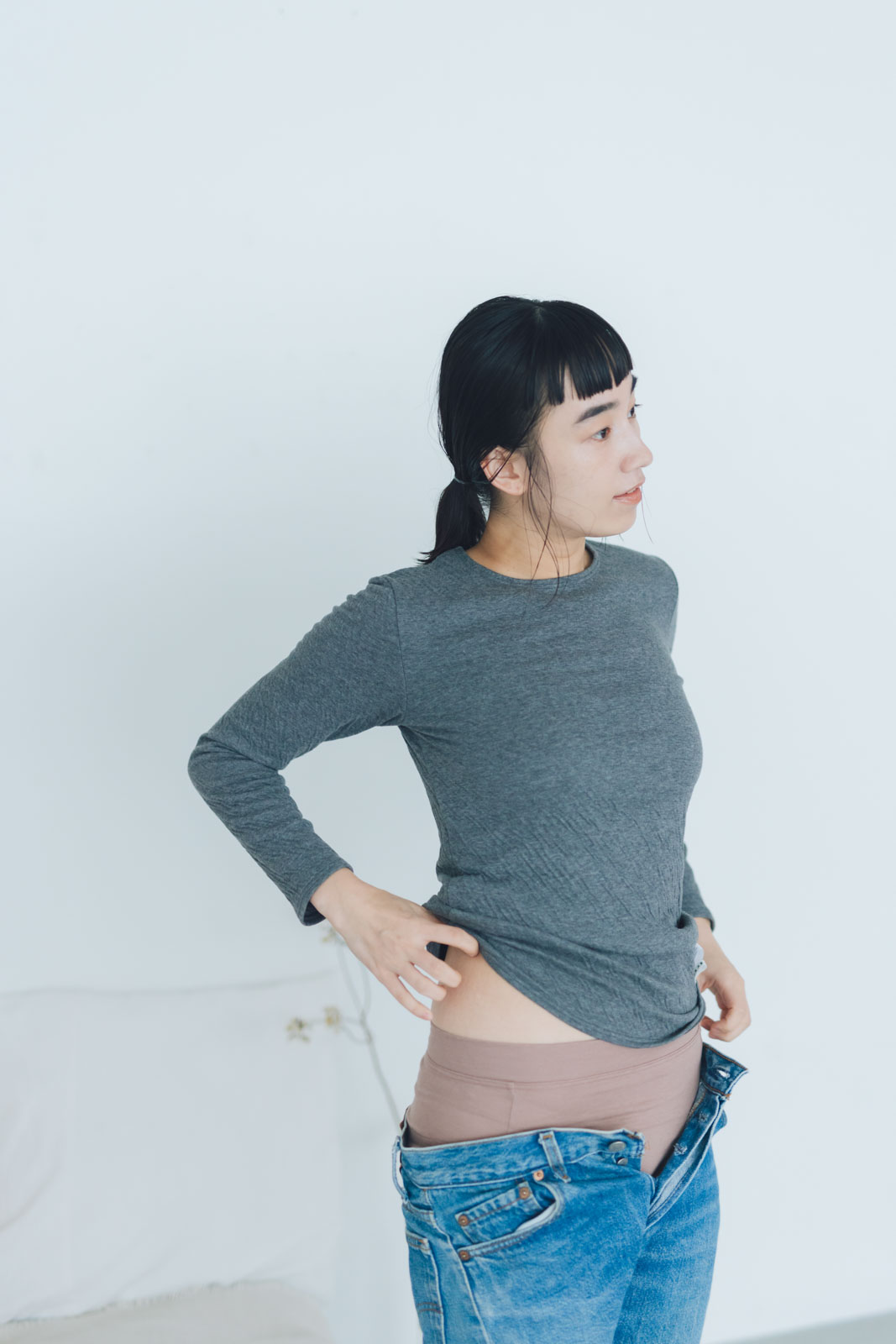 ウエストにはゴムを入れず、太めの幅でパワーネットを内蔵させ、面でウエストにフィットさせるので締め付け感や窮屈感がありません。
